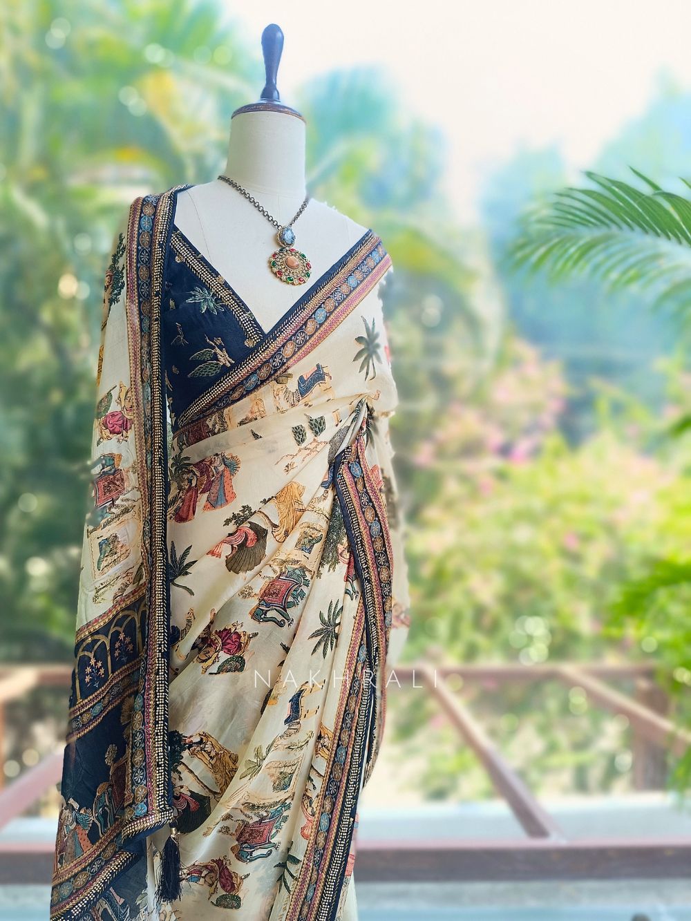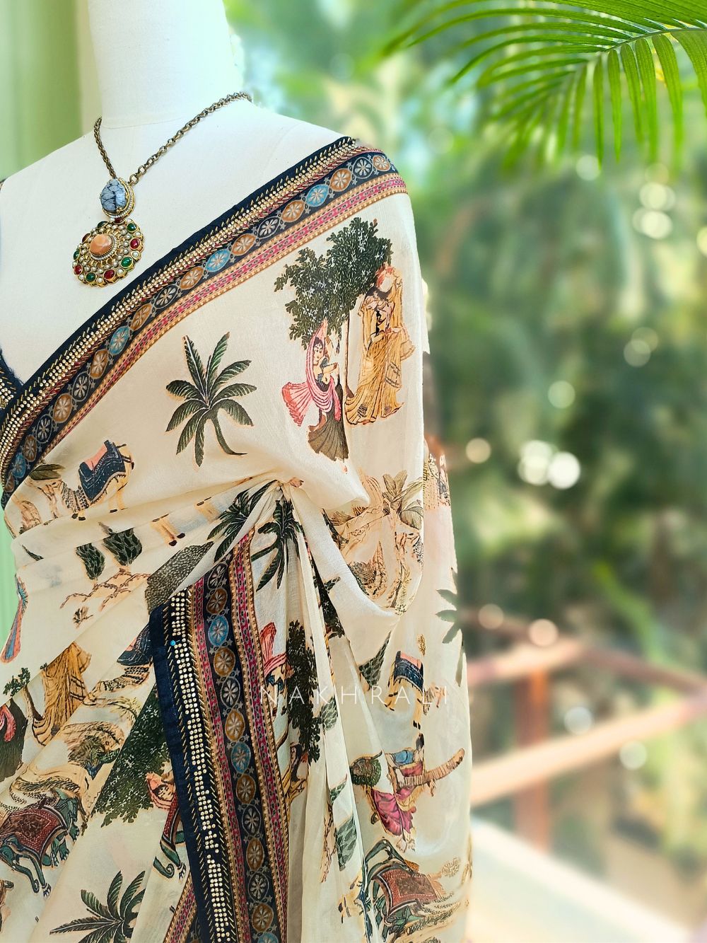 This saree showcases a beautifully illustrated printed base featuring scenic and cultural motifs spread across the drape. The contrast border enhances the overall look, adding structure and visual richness. Lightweight and easy to carry, it is ideal for casual outings, festive day events, and relaxed gatherings. It comes with a matching running blouse piece attached to the saree, allowing it to be stitched in the preferred style.