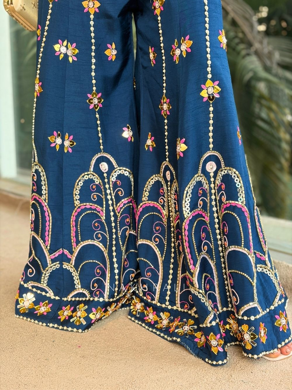 The Midnight Bloom Crop Top Palazzo Set is designed to stand out with its bold craftsmanship and modern festive appeal. The crop top features detailed hand embellishment across the neckline and bodice, highlighted with multicolour accents that add depth and richness. The palazzo is adorned with delicate vertical motifs and a heavily detailed hemline, creating graceful movement with every step. Completing the ensemble is a choker-style dupatta that frames the neckline beautifully and adds a contemporary edge. This set is ideal for festive evenings, sangeet nights, and celebratory gatherings where you want a refined yet striking look.