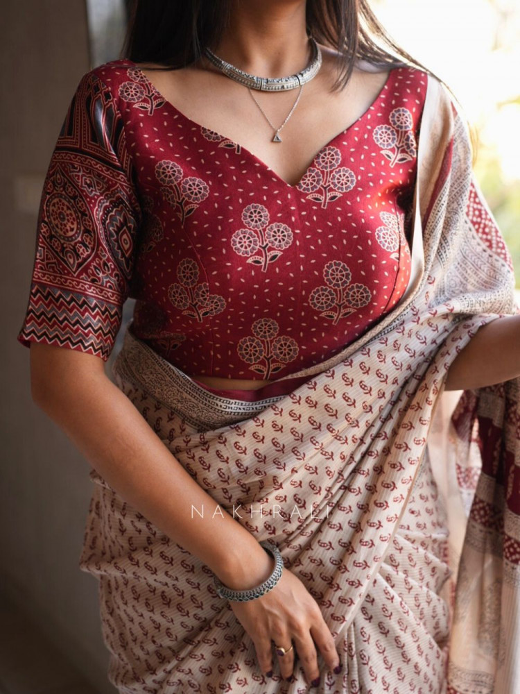 Crafted in soft modal silk, this blouse showcases intricate geometric and floral-inspired prints that bring depth and character to the silhouette. The V neckline enhances the neckline beautifully, while the tailored fit ensures a polished look without compromising comfort. The breathable fabric makes it ideal for extended wear, and the versatile design pairs seamlessly with printed, solid, or contrast sarees. A timeless staple for women who appreciate understated ethnic detailing with a modern edge.