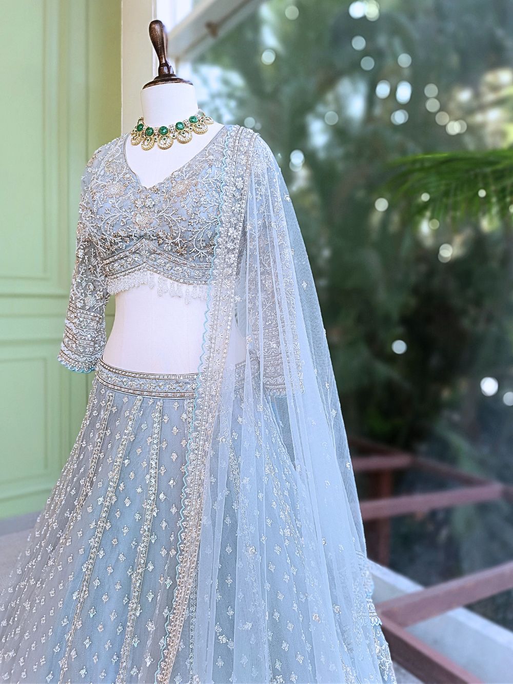 This lehenga set is designed with delicate cut dana and sequin work intricately spread across the flared silhouette, creating a soft shimmer with every movement. The blouse features a structured fit with detailed embroidery and a flattering neckline, while the dupatta adds a light and graceful finish with subtle motifs and bordered edges. Ideal for receptions, engagement ceremonies and wedding celebrations, it offers a perfect blend of elegance and modern charm.