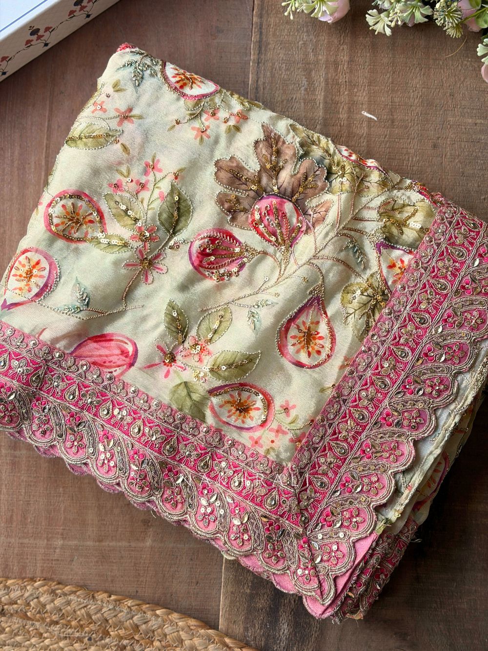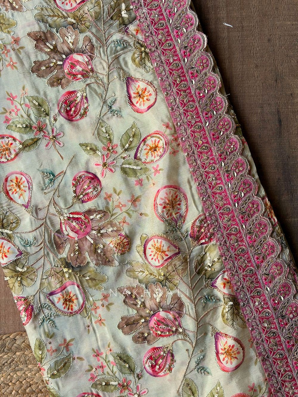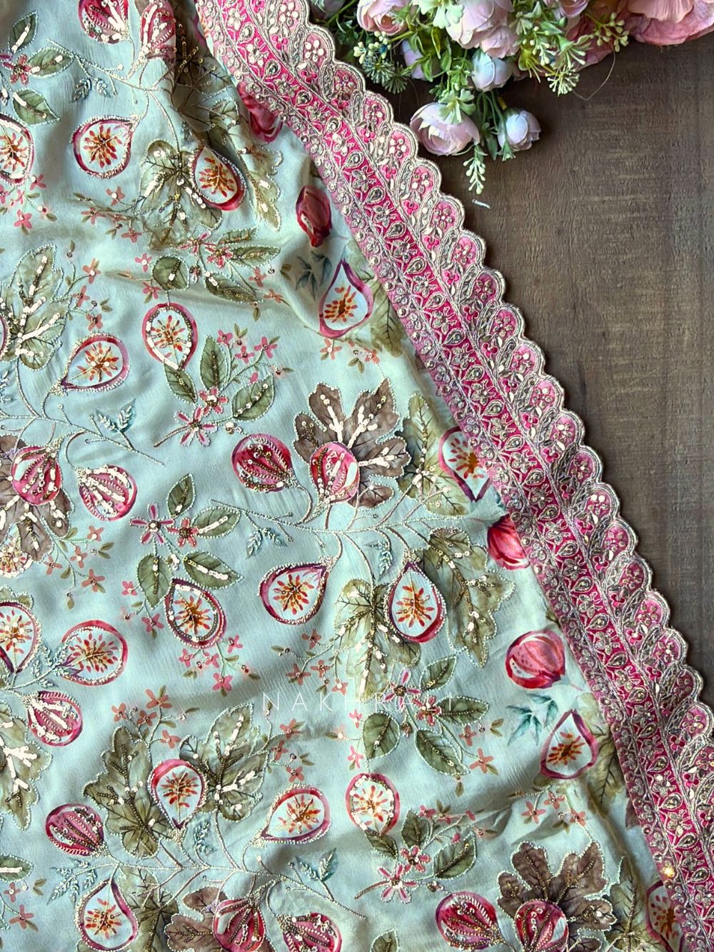 Nirvitha Pista Green Saree with Printed Embroidery and Sequin Work