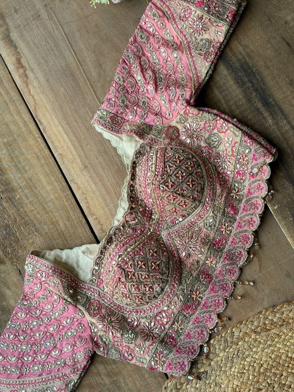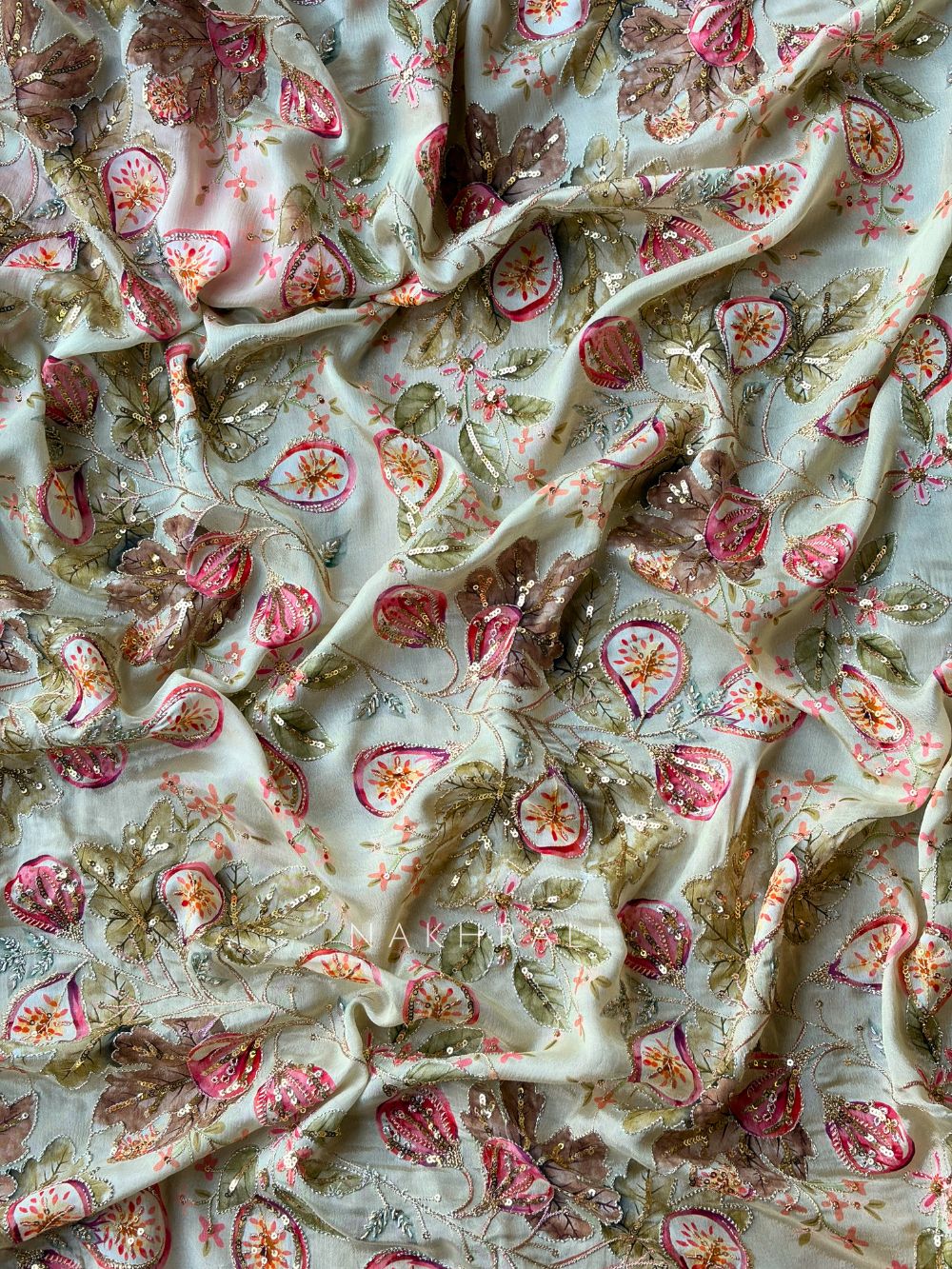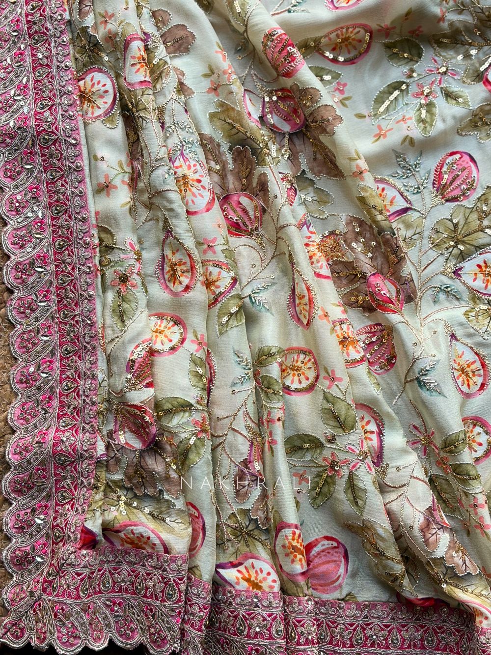 This saree showcases soft printed floral patterns layered with intricate embroidery and fine sequin bead embellishments, creating a rich yet graceful appeal. The fluid drape adds effortless movement, while the detailed border enhances its overall finish. It comes with a heavily embellished readymade blouse featuring statement sleeve detailing, making it ideal for festive occasions, wedding functions, and special celebrations.