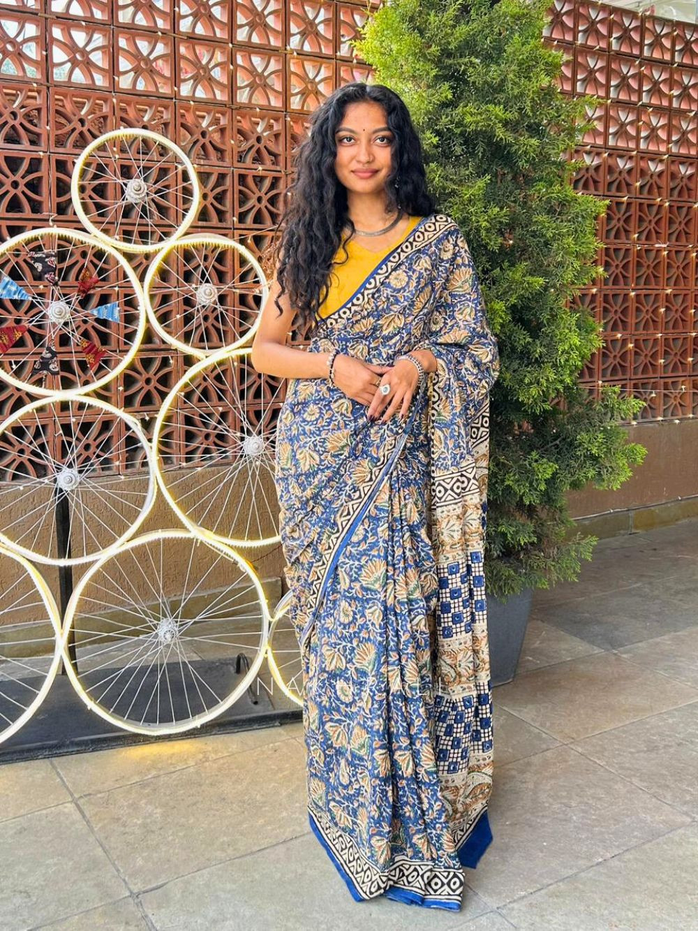 This blue cotton saree is designed for effortless everyday elegance, showcasing a detailed floral print balanced with a thoughtfully patterned pallu and border. The cotton fabric keeps it lightweight and breathable, making it ideal for long hours of wear. The saree drapes softly and maintains structure, giving a neat, graceful fall. It comes with a matching unstitched blouse piece attached to the saree, allowing it to be stitched in the preferred style. A perfect pick for workdays, casual gatherings, and relaxed festive moments.