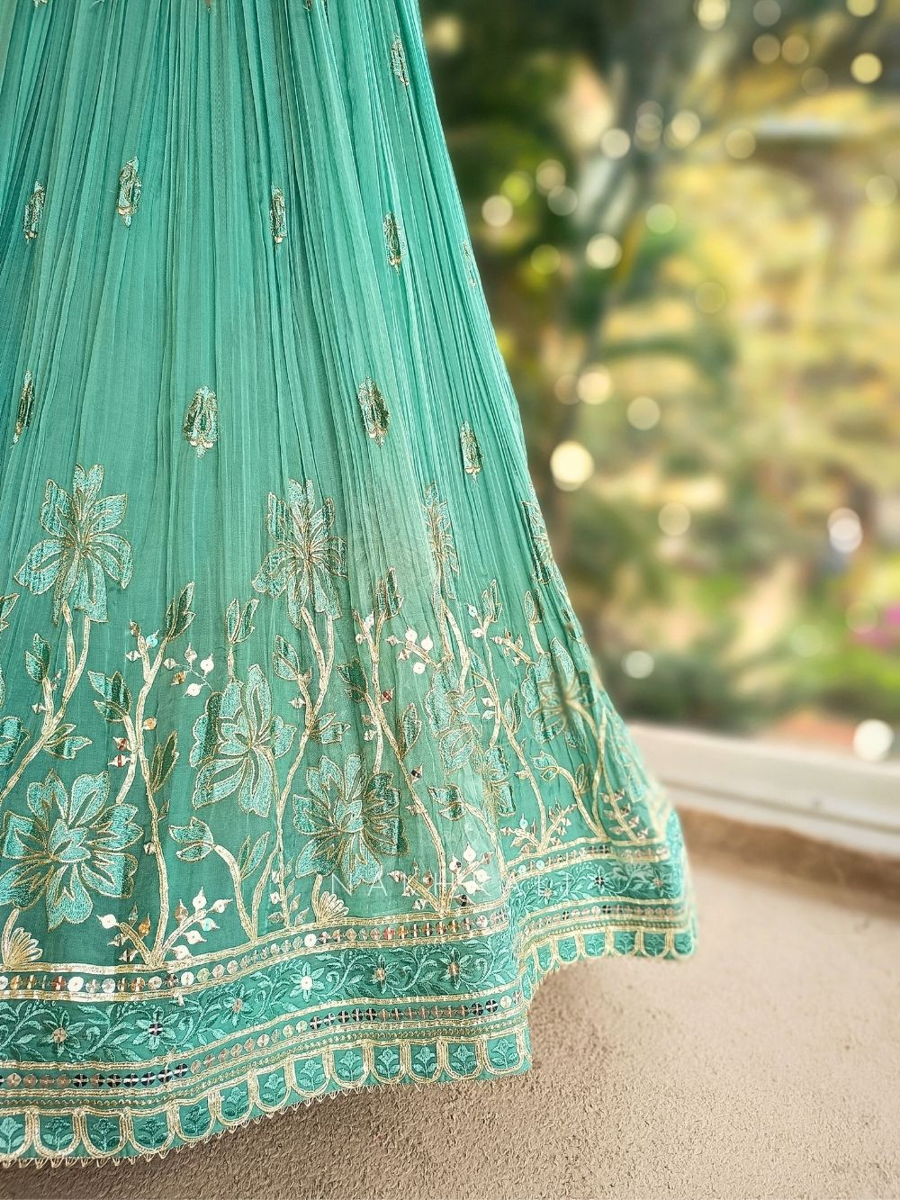 This sea green Anarkali set is designed with detailed zardozi embroidery highlighting the fitted bodice and flowing flare, creating a graceful silhouette. The Anarkali features a structured neckline and a beautifully finished hem adorned with floral motifs. It comes paired with a matching lightweight dupatta detailed with delicate embellishments and coordinated pants that complete the ensemble. Ideal for festive gatherings, wedding functions, and elegant evening occasions where refined craftsmanship matters more than excess shine.