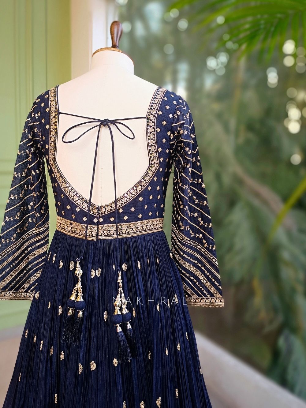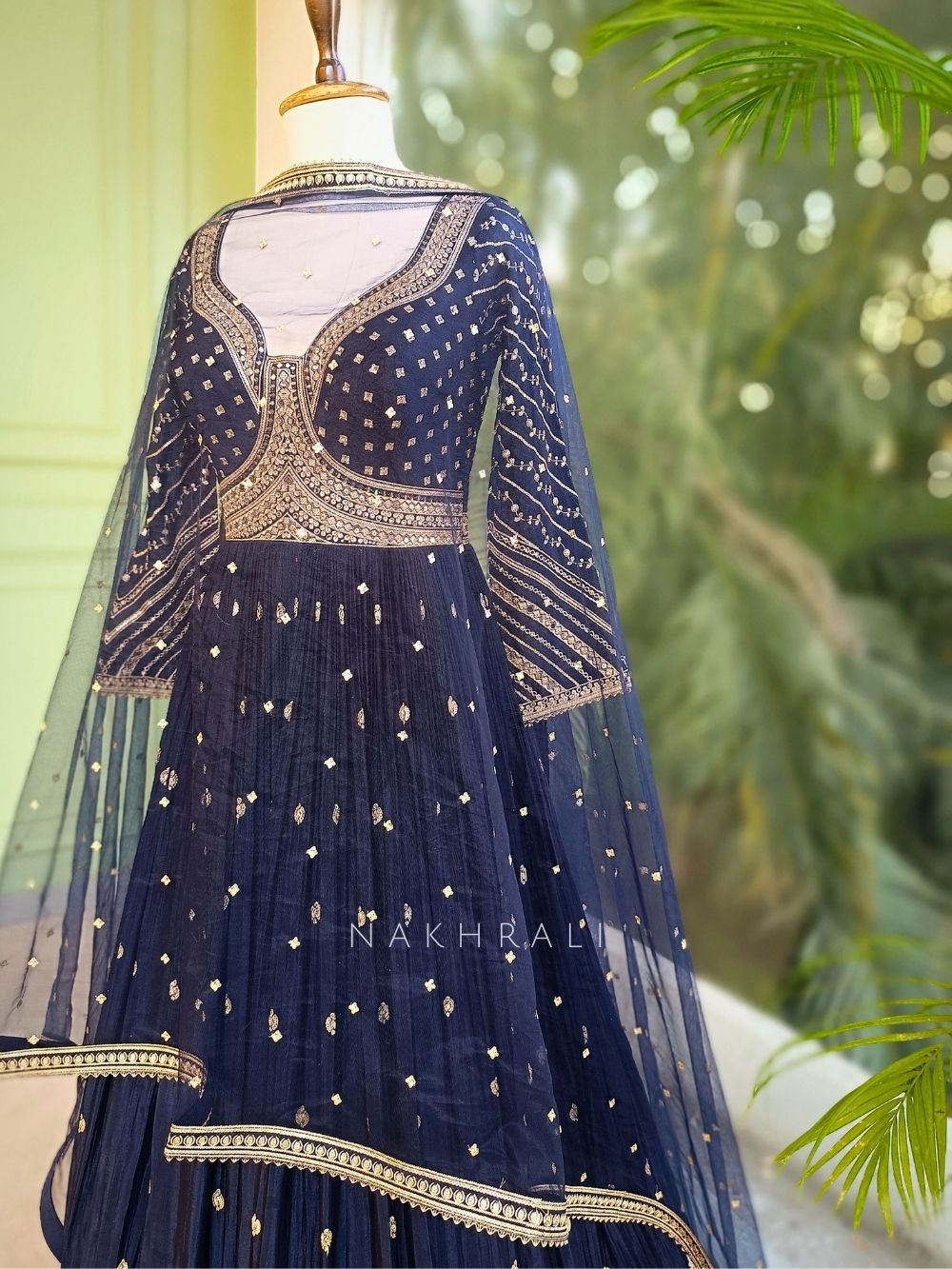 This blue anarkali set is designed with a beautifully structured bodice highlighted by detailed gold-toned work that defines the neckline and waist. The anarkali flows into a finely pleated flare, accented with delicate motifs scattered across the body and a richly worked border at the hem for a grand finish. The sleeves carry coordinated linear detailing, while the back features an elegant tie-up detail that adds charm and adjustability. It comes paired with matching pants and a sheer dupatta finished with a refined border, making it a complete ensemble ideal for festive celebrations, evening functions, and wedding gatherings.