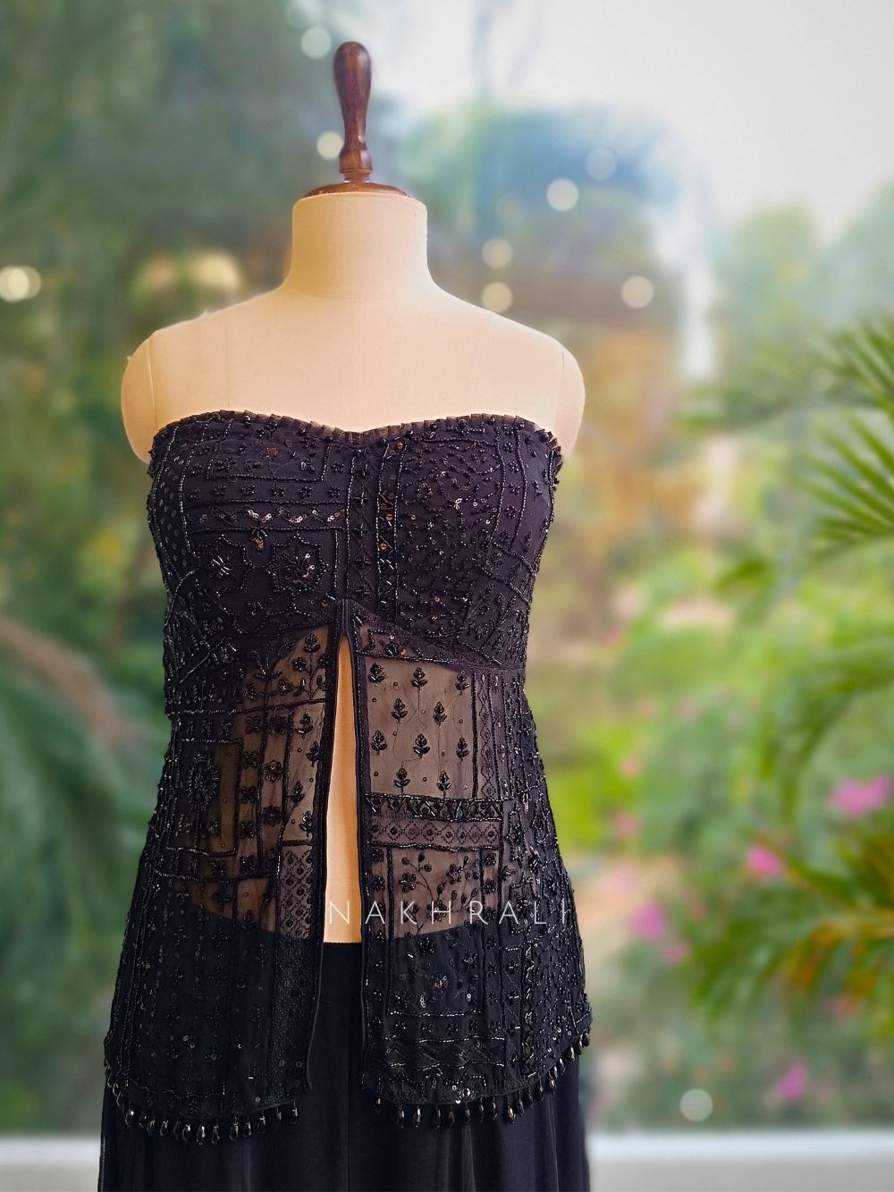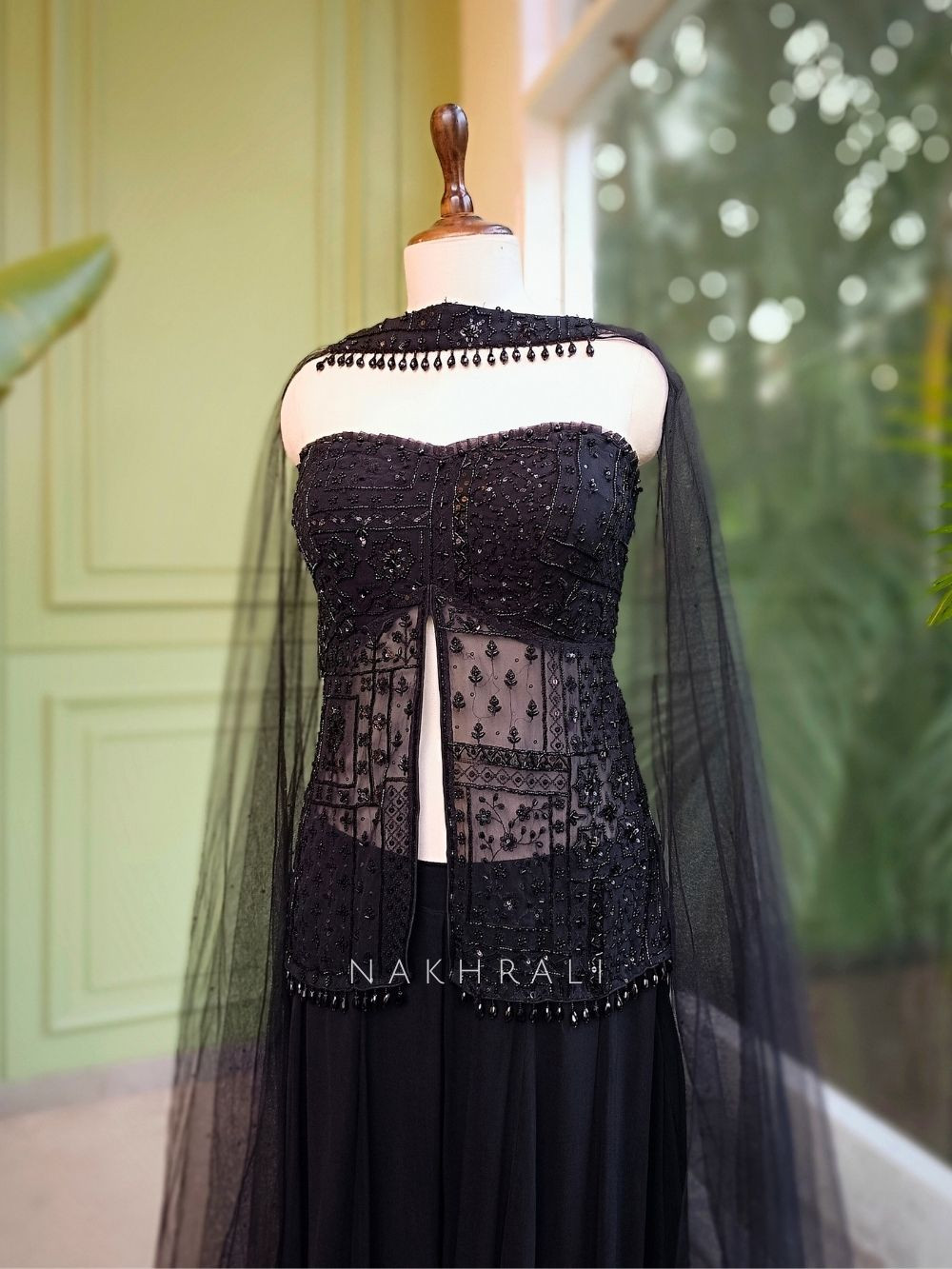 Dry clean only. Store in muslin cloth to maintain embroidery. Avoid perfume and direct sunlight on embellishments. Steam at low heat if necessary. Handle delicately to preserve intricate detailing.