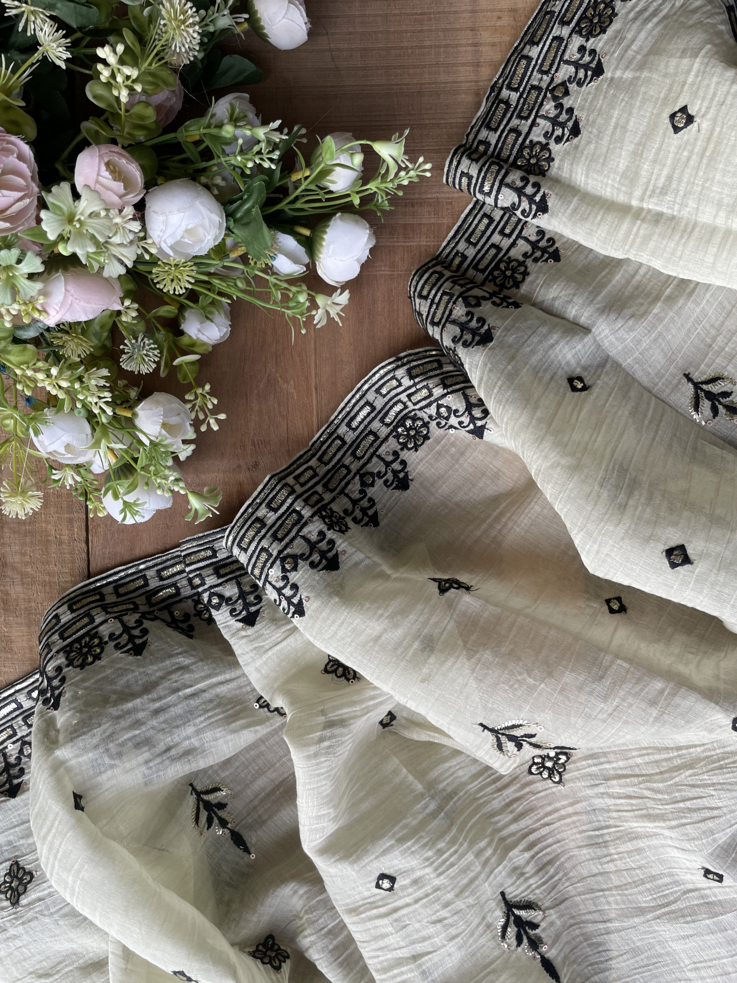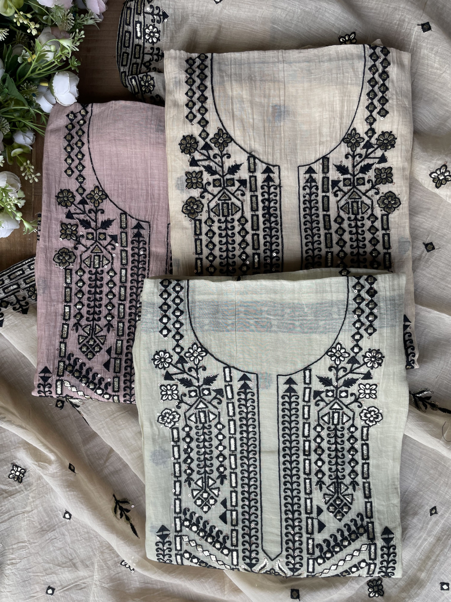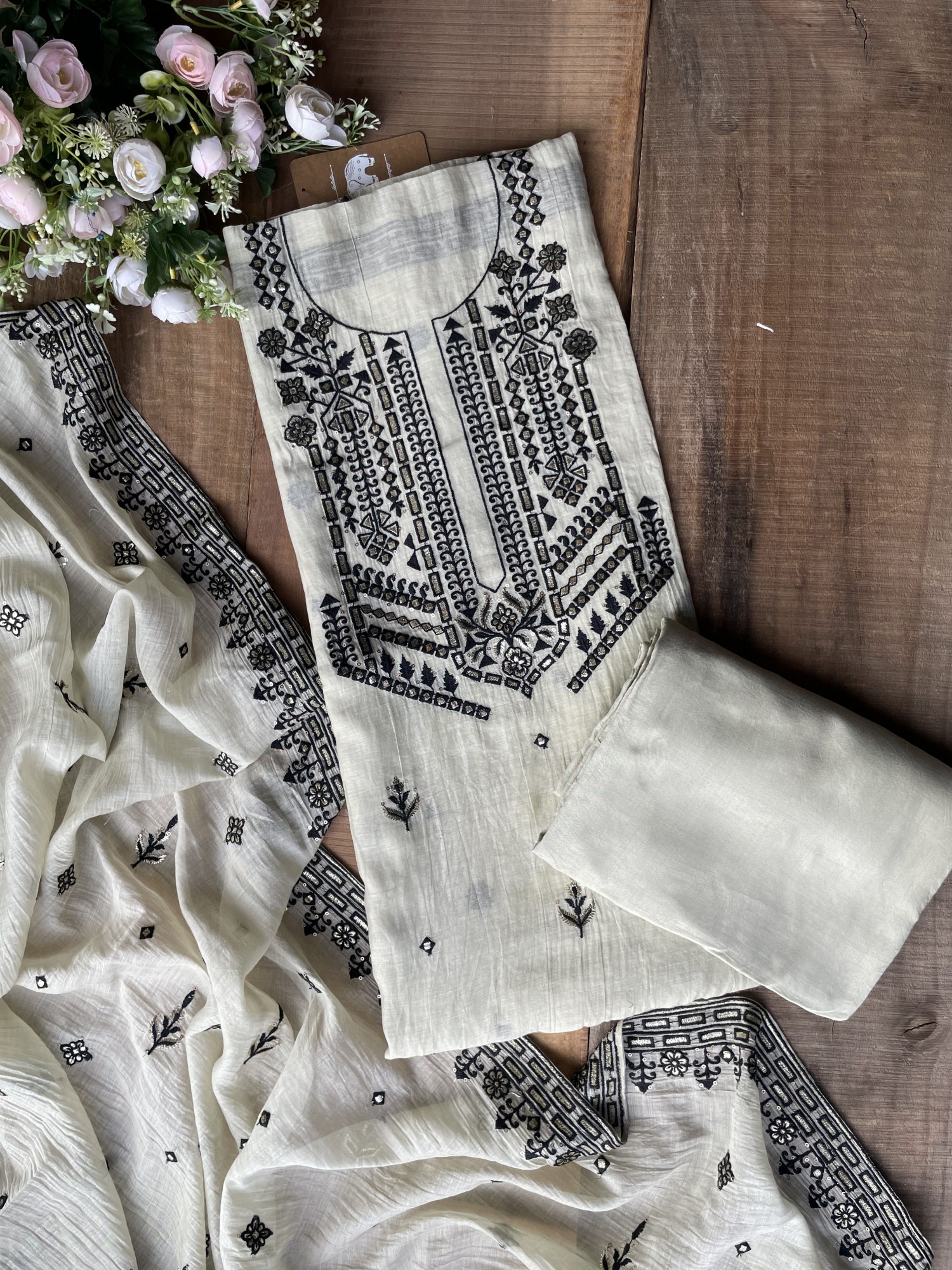 This elegant dress material is crafted in a breathable cotton silk blend fabric, known for its soft texture and natural matte finish. The kurta fabric features detailed black thread embroidery arranged in symmetrical vertical panels with delicate floral and geometric motifs, creating a striking contrast against the light base. Subtle sequin accents are added within the embroidery to give a soft, understated shimmer without overpowering the design. The set includes a coordinated bottom fabric in the same cotton silk blend and a lightweight dupatta adorned with scattered embroidered motifs and a matching border, completing the look with balance and grace. Ideal for those who prefer refined ethnic wear that works across occasions.