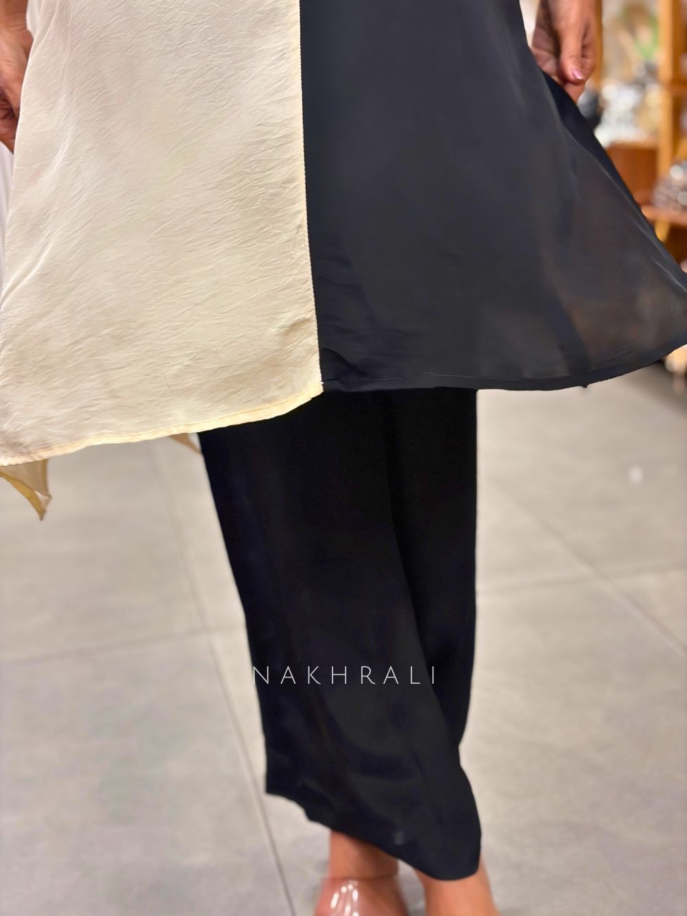 This indo western kaftan set is designed with a strong contemporary edge, featuring a striking dual-tone palette that blends classic black with a soft contrasting panel. The silhouette is relaxed and flowy, offering both comfort and a refined drape. The neckline is intricately highlighted with geometric sequin work, adding subtle shine and structure without overpowering the minimal design. The kaftan-style top creates a fluid fall, while the asymmetrical contrast detailing enhances visual depth. Paired with straight-cut parallel pants, the set maintains a clean, elongated silhouette—making it ideal for modern festive dressing, intimate gatherings, and evening wear where understated styling stands out more than heavy embellishment.