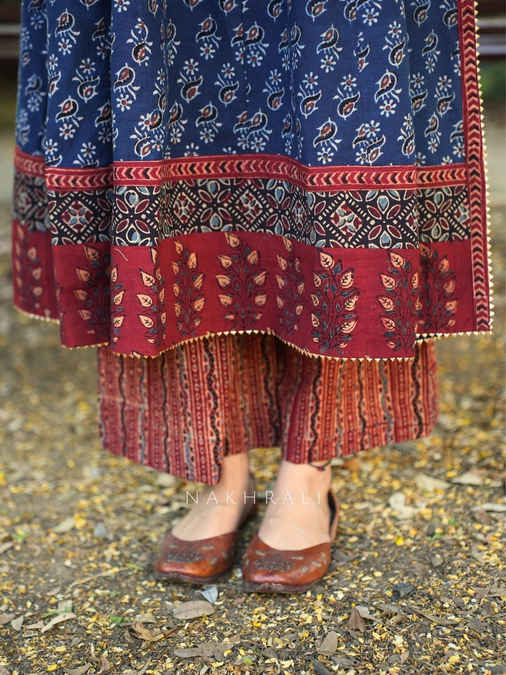 The Noori Cotton Flared Kurta Pant Set is crafted in breathable cotton and designed to balance everyday comfort with handcrafted detailing. The kurta features a graceful flared silhouette enhanced with patchwork detailing on the neckline, sleeves, and hemline. Subtle sequin and bead work on the neckline and sleeves add a refined festive touch without overpowering the look. The kurta falls beautifully, making it suitable for both casual and semi-festive wear. The matching cotton pants come with functional pockets, adding practicality to the ensemble while maintaining a coordinated, effortless finish.
