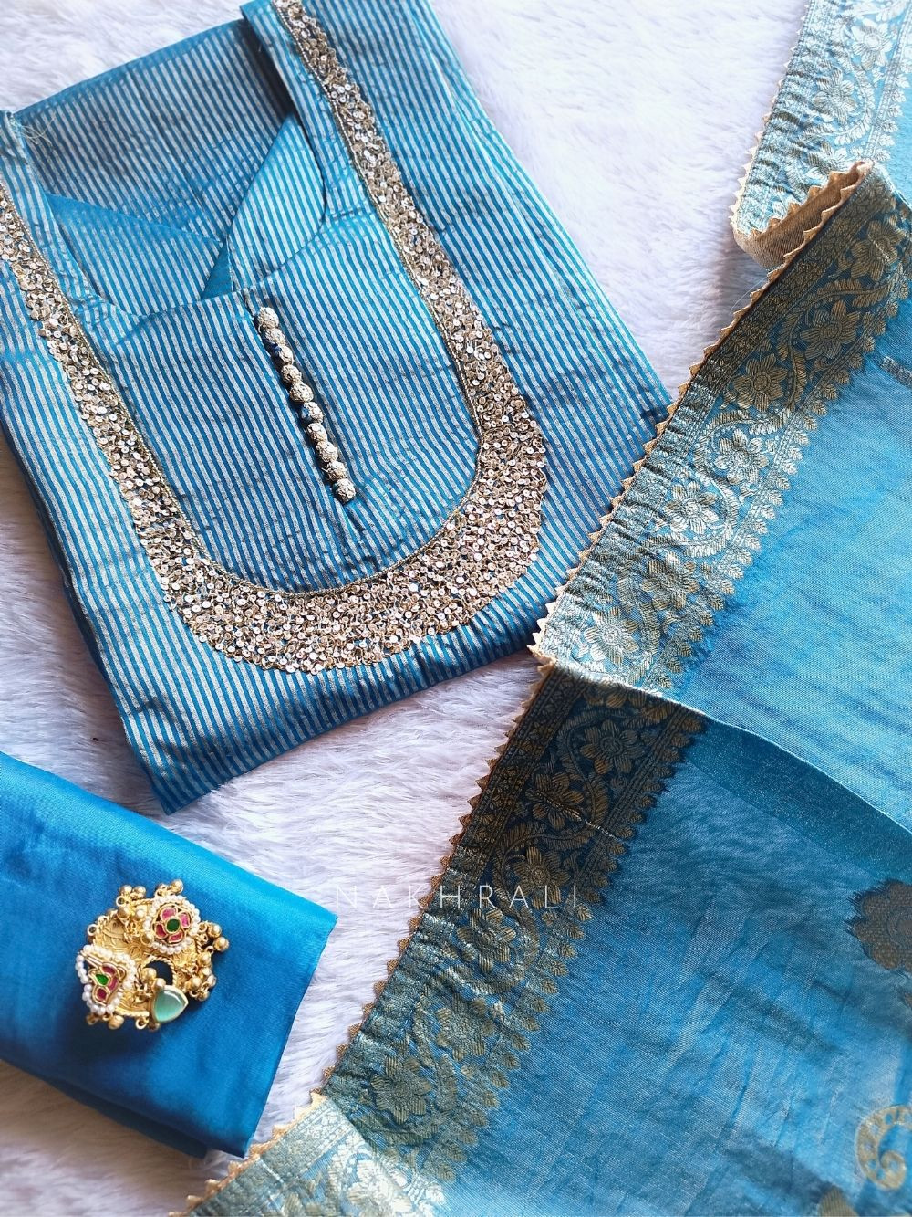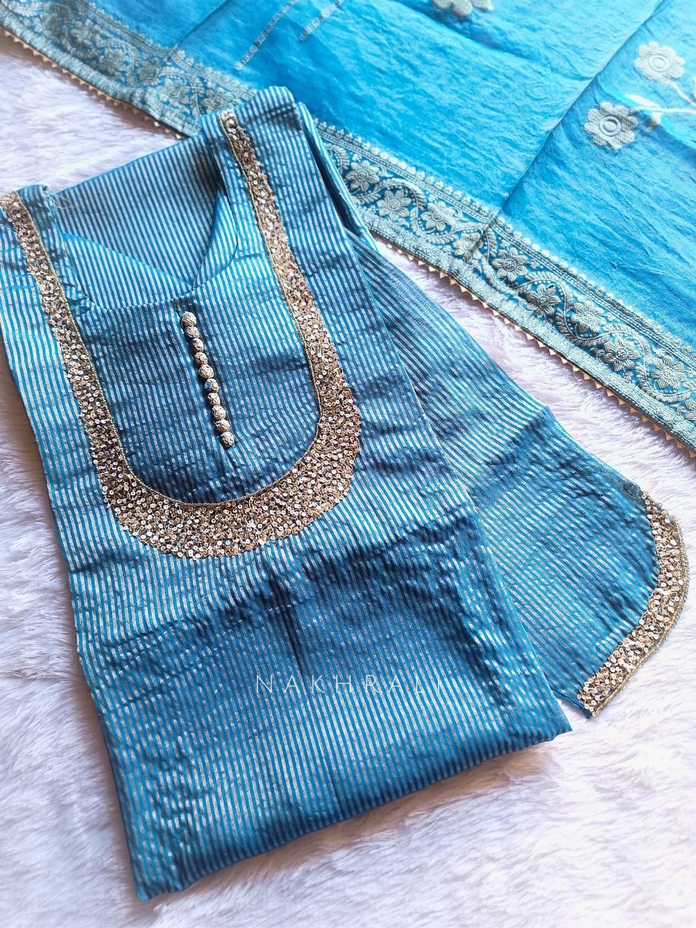 Noorline Glow is where minimal elegance meets festive finesse. This semi-stitched dress material features a zari-lined fabric base, delicately enhanced with sequin and cut dana work along the neckline. Paired with a beautifully woven organza dupatta with zari detailing and a soft powder silk bottom, the set offers a graceful silhouette. Perfect for day functions, wedding rituals, or when you want that effortless celebration glow.