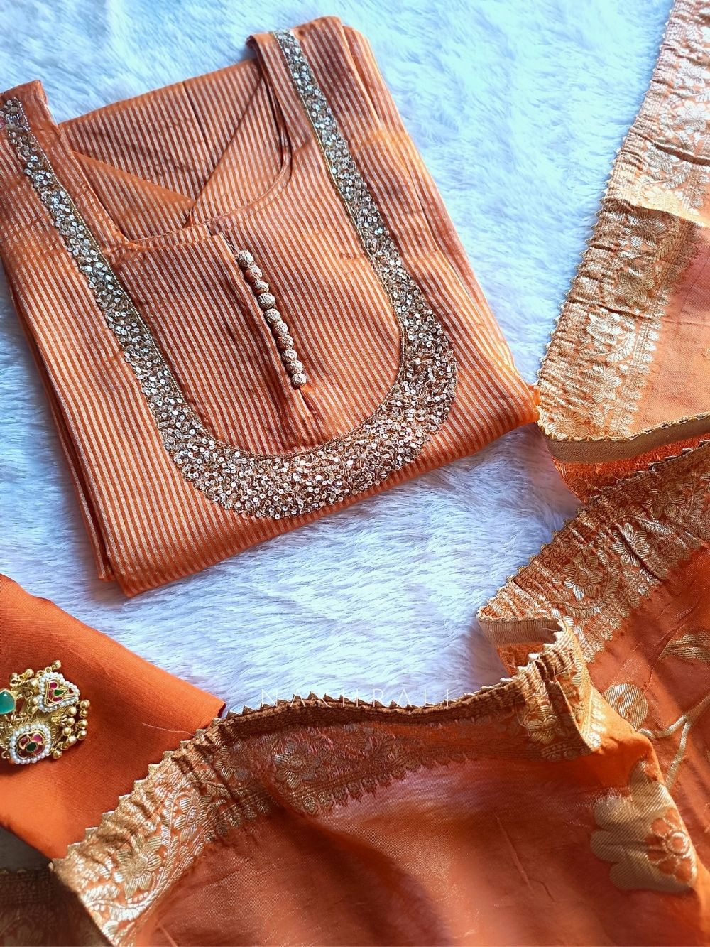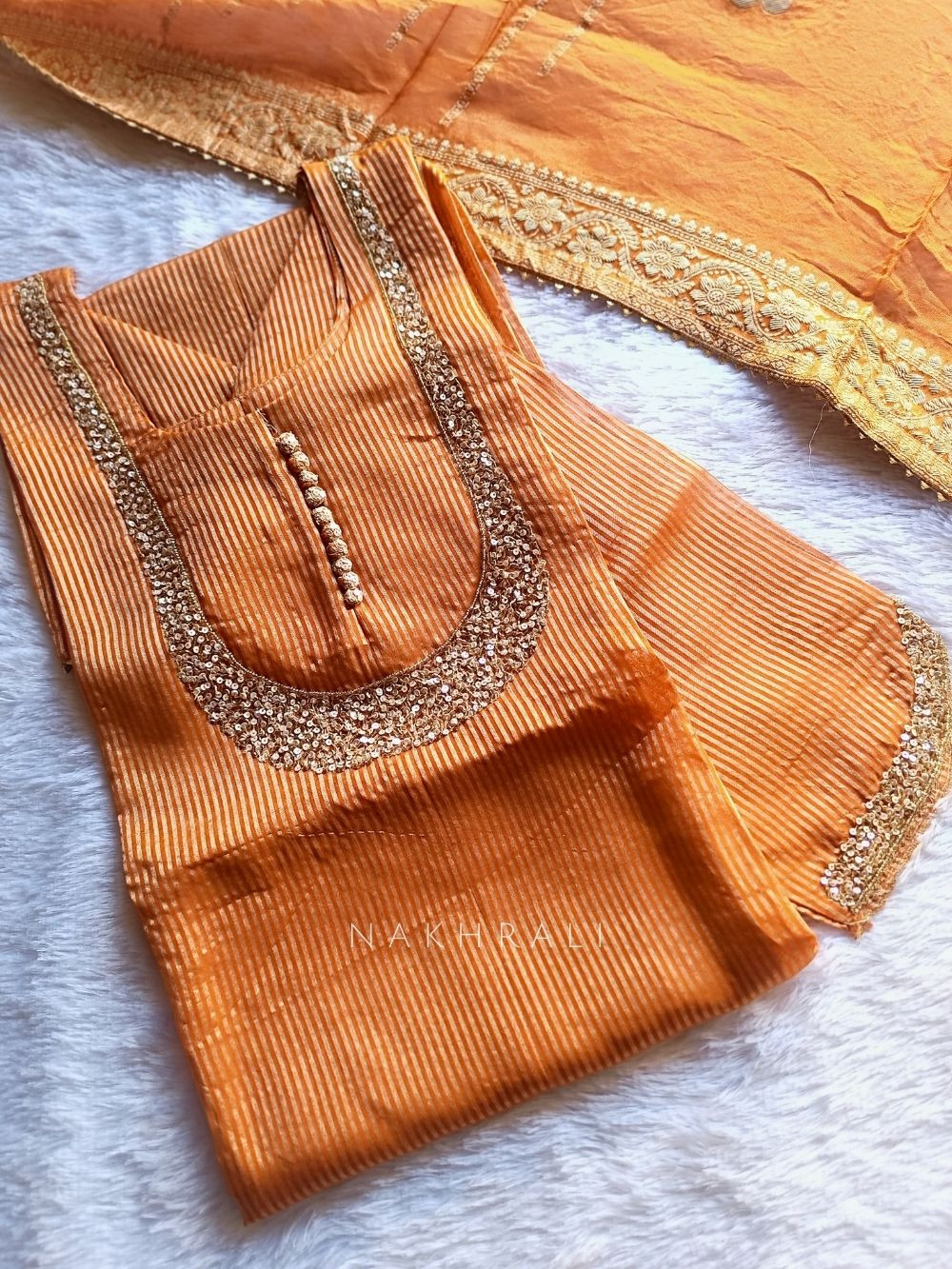 Noorline Glow is where minimal elegance meets festive finesse. This semi-stitched dress material features a zari-lined fabric base, delicately enhanced with sequin and cut dana work along the neckline. Paired with a beautifully woven organza dupatta with zari detailing and a soft powder silk bottom, the set offers a graceful silhouette. Perfect for day functions, wedding rituals, or when you want that effortless celebration glow.