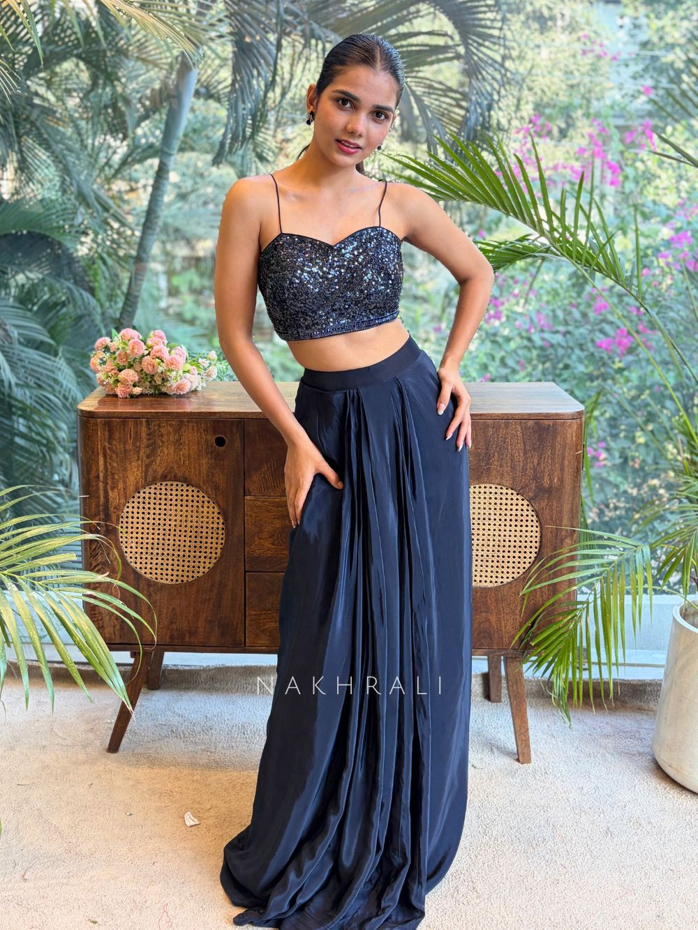 This blue ensemble blends bold modern style with intricate detailing. The crop top is adorned with shimmering sequins and beadwork that adds a striking, textured shine. The coordinating jacket elevates the outfit with heavy cut dana and bead embellishments along the front and sleeves. The fluid skirt features a beautifully structured drape that enhances movement and adds drama. Perfect for cocktail nights, receptions, or any event where you want a standout contemporary statement.