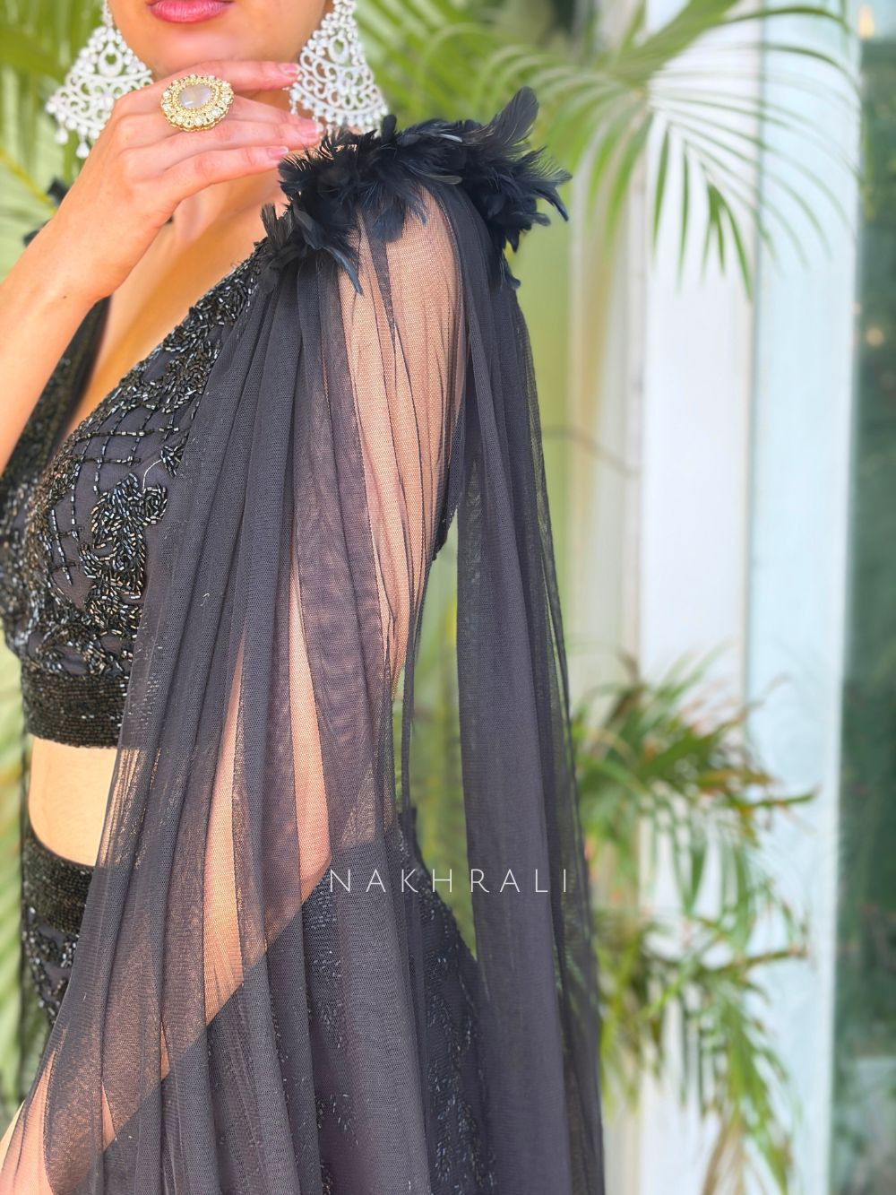 Nova is a refined indo-western crop top and skirt set designed for modern celebrations. The set features intricate cut dana work spread evenly across the fabric, creating a rich textured finish without looking heavy. The crop top comes with elegant cape-style sleeves that add movement and drama, while the fitted skirt balances the look with a clean, elongated fall. The craftsmanship focuses on detailing rather than excess, making this outfit bold yet wearable. Available in classic black and striking blue, this set is ideal for cocktail nights, festive gatherings and stylish celebrations where contemporary Indian wear stands out.