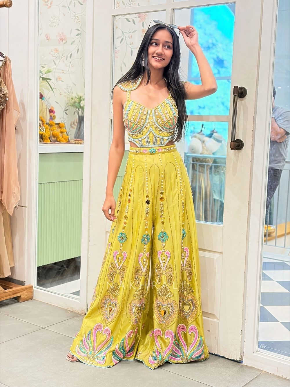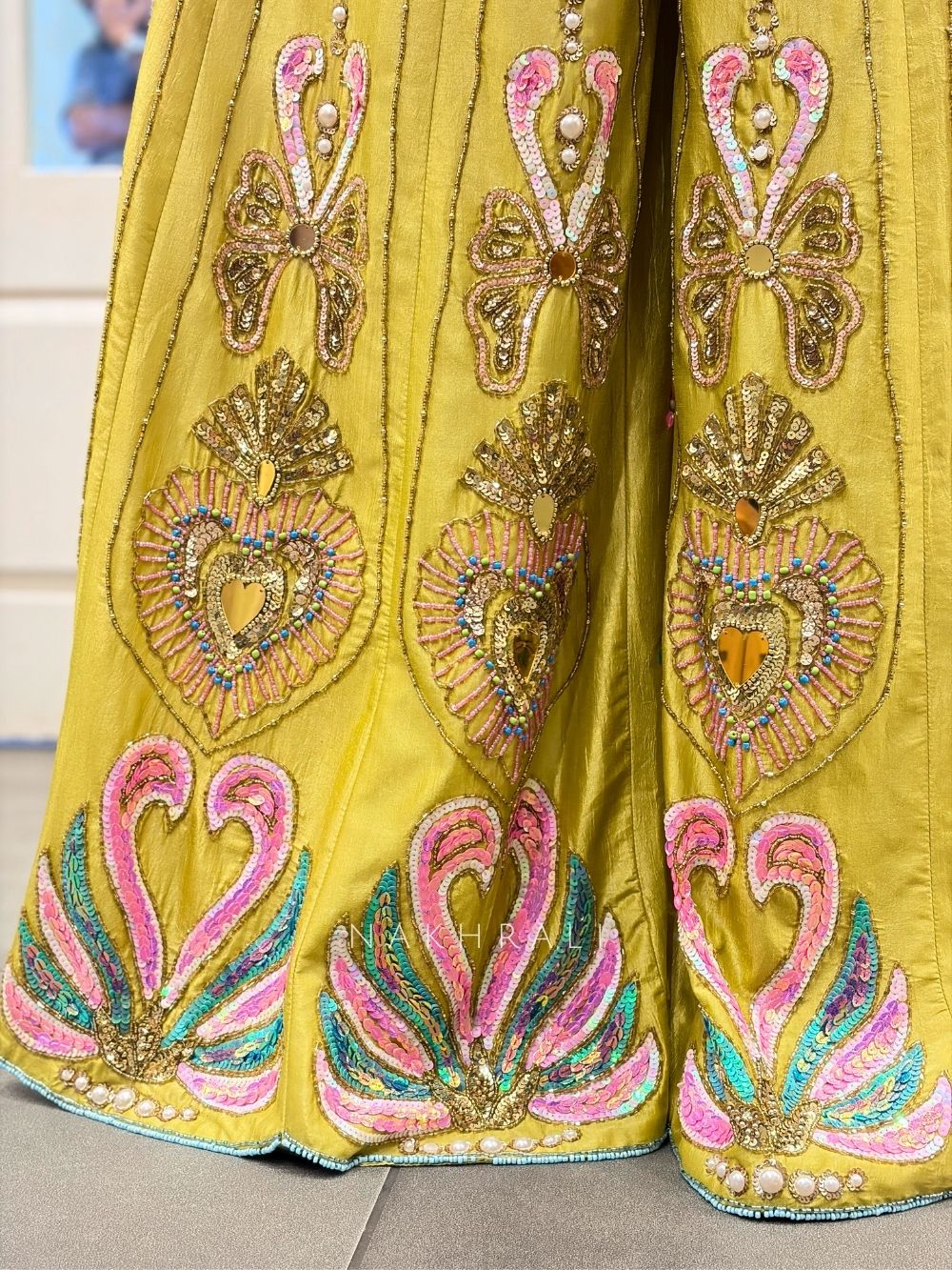 This Parrot Green jumpsuit is designed with a structured, sculpted bodice heavily embellished with mirror, beads and sequins in intricate pastel patterns. The fitted top flows into wide, flared bottoms detailed with vertical motifs and ornate placement work, creating a lehenga-inspired silhouette. The design blends modern cuts with traditional craftsmanship, making it ideal for cocktail nights, festive gatherings and statement occasion wear.