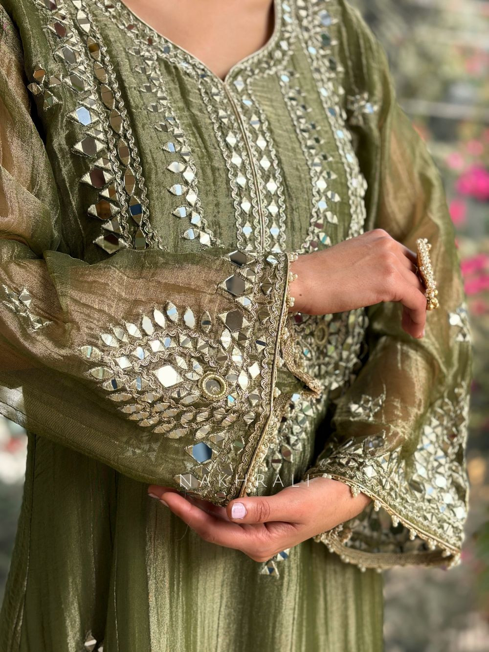 Poise Green Tissue Long Dress with Mirror and Zari Work