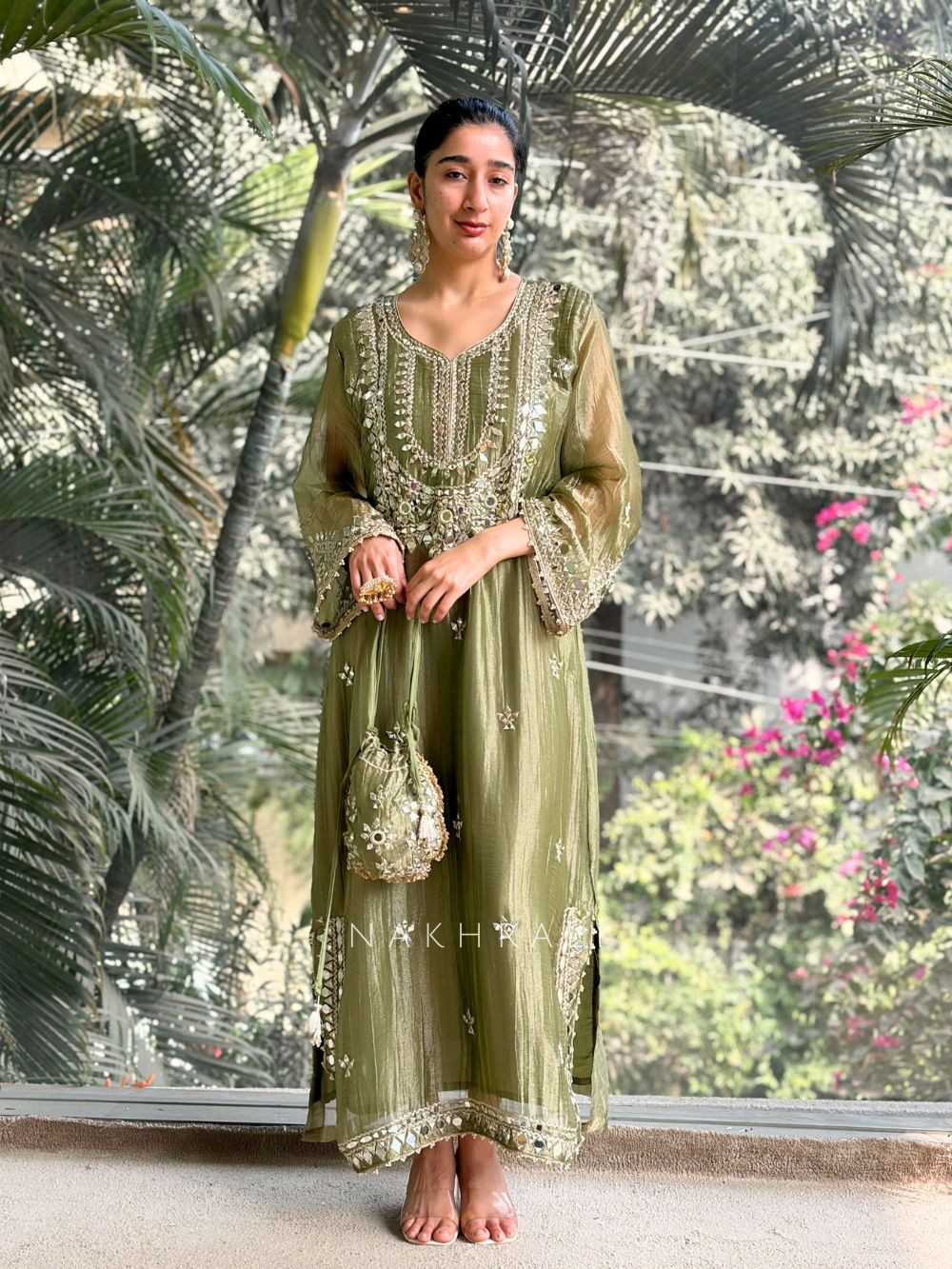 Poise is a refined long dress crafted in lustrous tissue fabric, designed to make a graceful statement at festive and celebratory occasions. The silhouette is enhanced with intricate mirror and zari work placed thoughtfully across the bodice, sleeves, and hem, adding richness while keeping the overall look balanced. The fabric’s natural sheen lends a regal finish, while the flowing structure ensures comfort and ease of movement. This dress comes paired with a coordinated potli bag, detailed to complement the outfit seamlessly, making it a complete and thoughtfully styled ensemble. Suitable for weddings, festive gatherings, and evening celebrations.