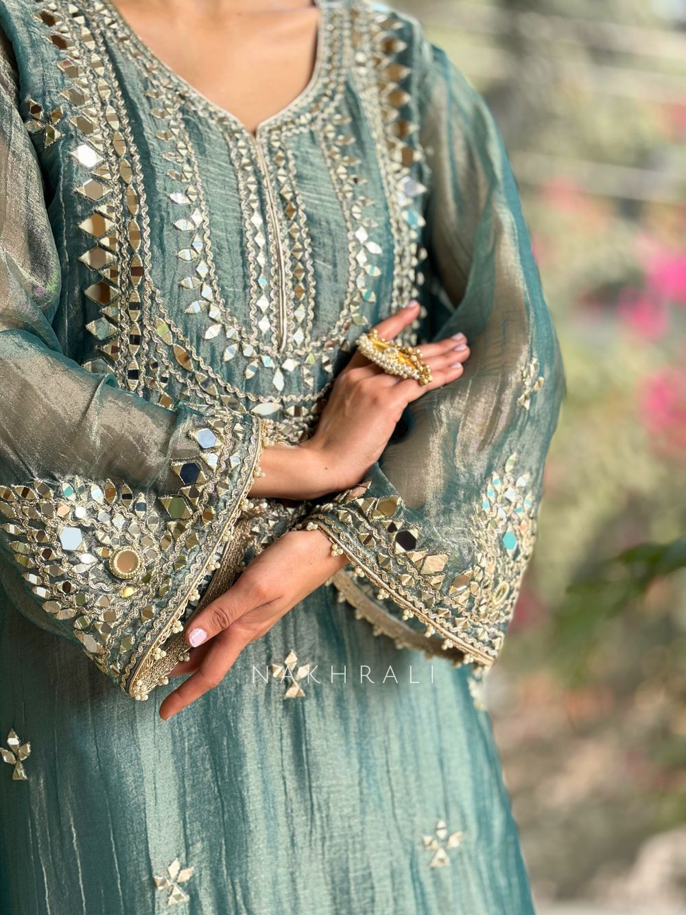 Poise Teal Blue Tissue Long Dress with Mirror and Zari Work
