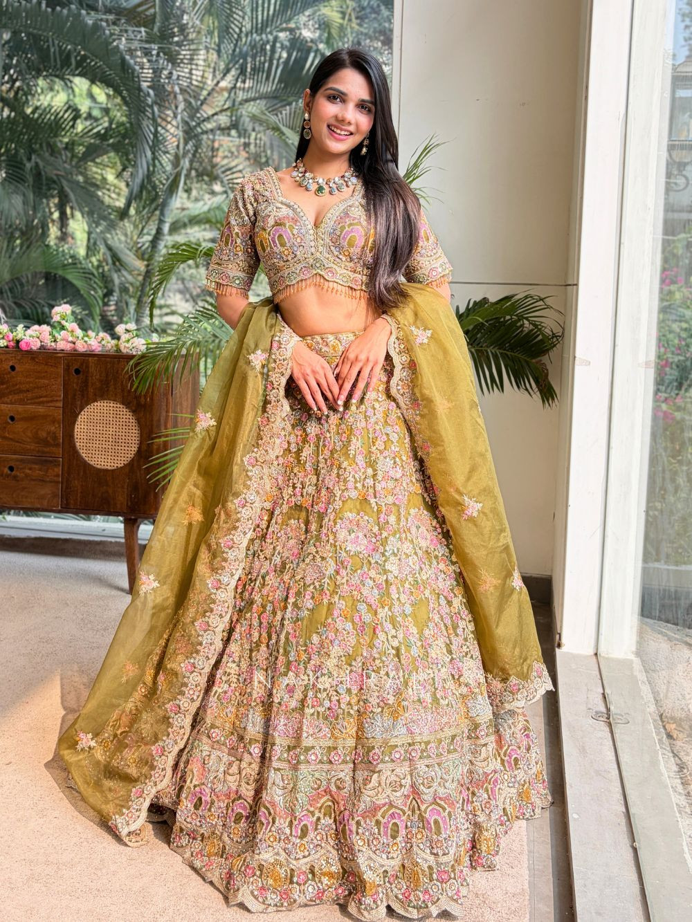 This mehendi green lehenga features exquisite all-over embroidery crafted in soft pastel tones, creating a rich and regal look. The blouse showcases detailed handwork with defined motifs, adding dimension and elegance. The lehenga hem is heavily embellished with intricate patterns, giving it a luxurious and festive appeal. Paired with a matching embroidered dupatta, this set is perfect for weddings, sangeet nights, festive celebrations and grand family functions.