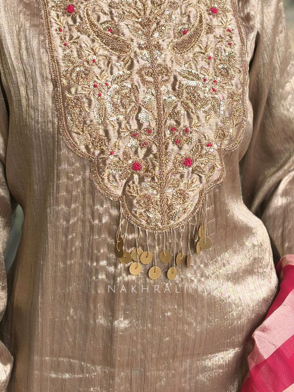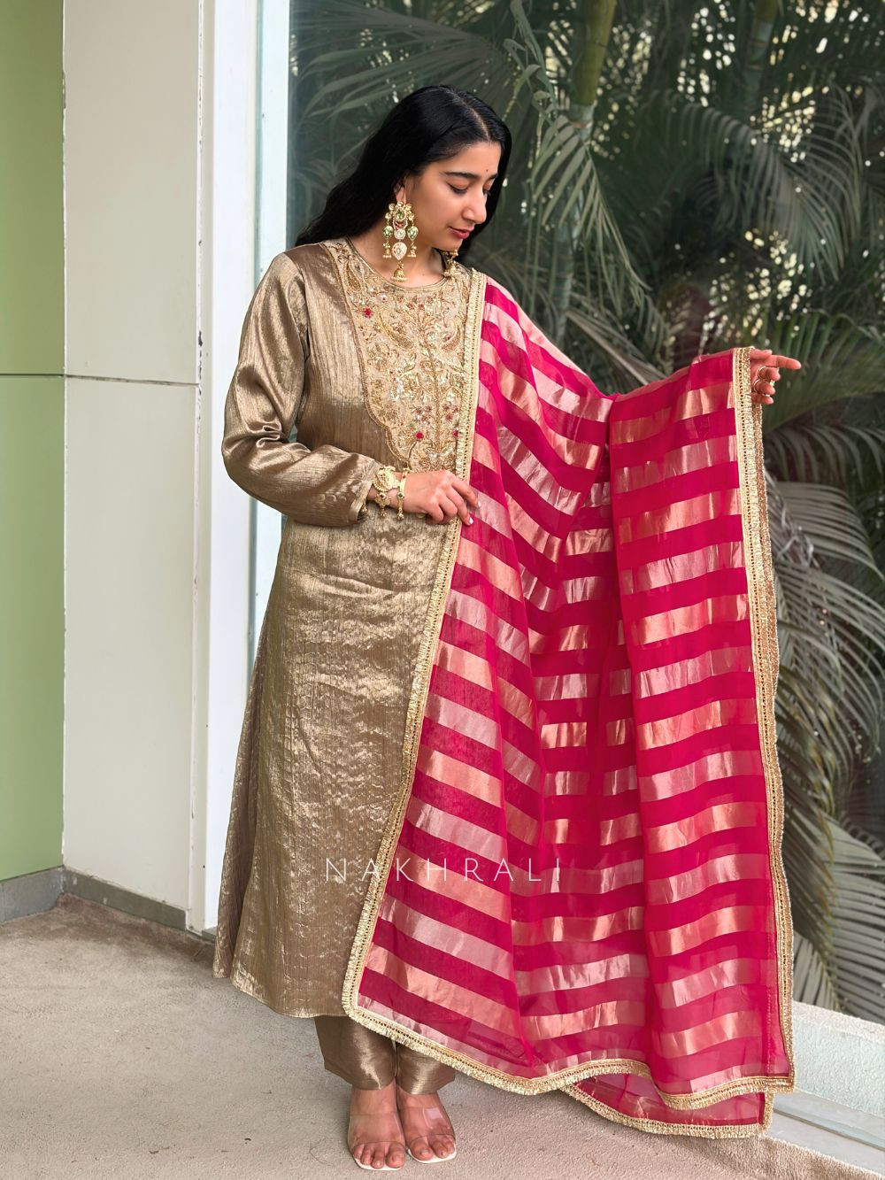 This suit set stands out with its detailed front embroidery highlighted by delicate accents and hanging elements that add depth and movement. The straight-cut silhouette keeps the look timeless, while the contrast dupatta adds a bold visual break, enhancing the overall appeal. The set is ideal for celebrations where understated elegance is preferred, offering comfort, structure, and festive charm without feeling heavy or overdone.