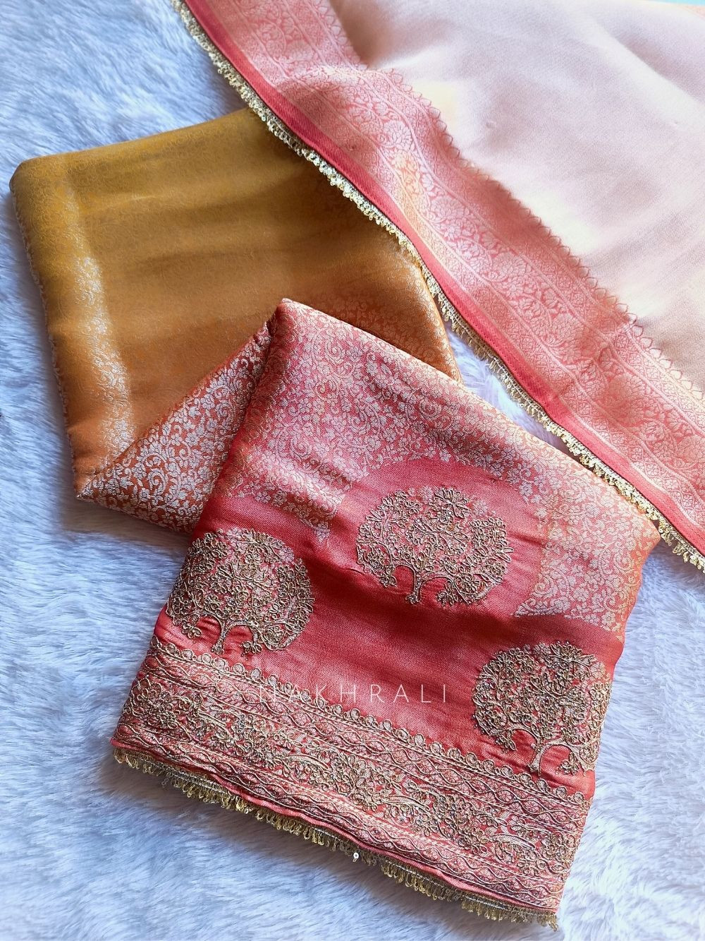 This exquisite ombre dress material showcases a seamless blend of soft gradients enriched with detailed zari and sequin embroidery. The fabric features ornate floral motifs, rich woven borders, and a subtle sheen that enhances its festive appeal. Beautifully crafted for custom stitching, it drapes effortlessly and ensures a refined traditional look. Ideal for weddings, festive ceremonies, or statement ethnic outfits, it offers the perfect base for creating a timeless ensemble.
