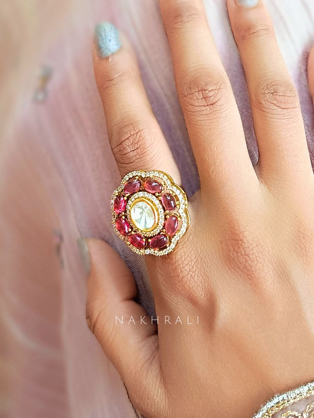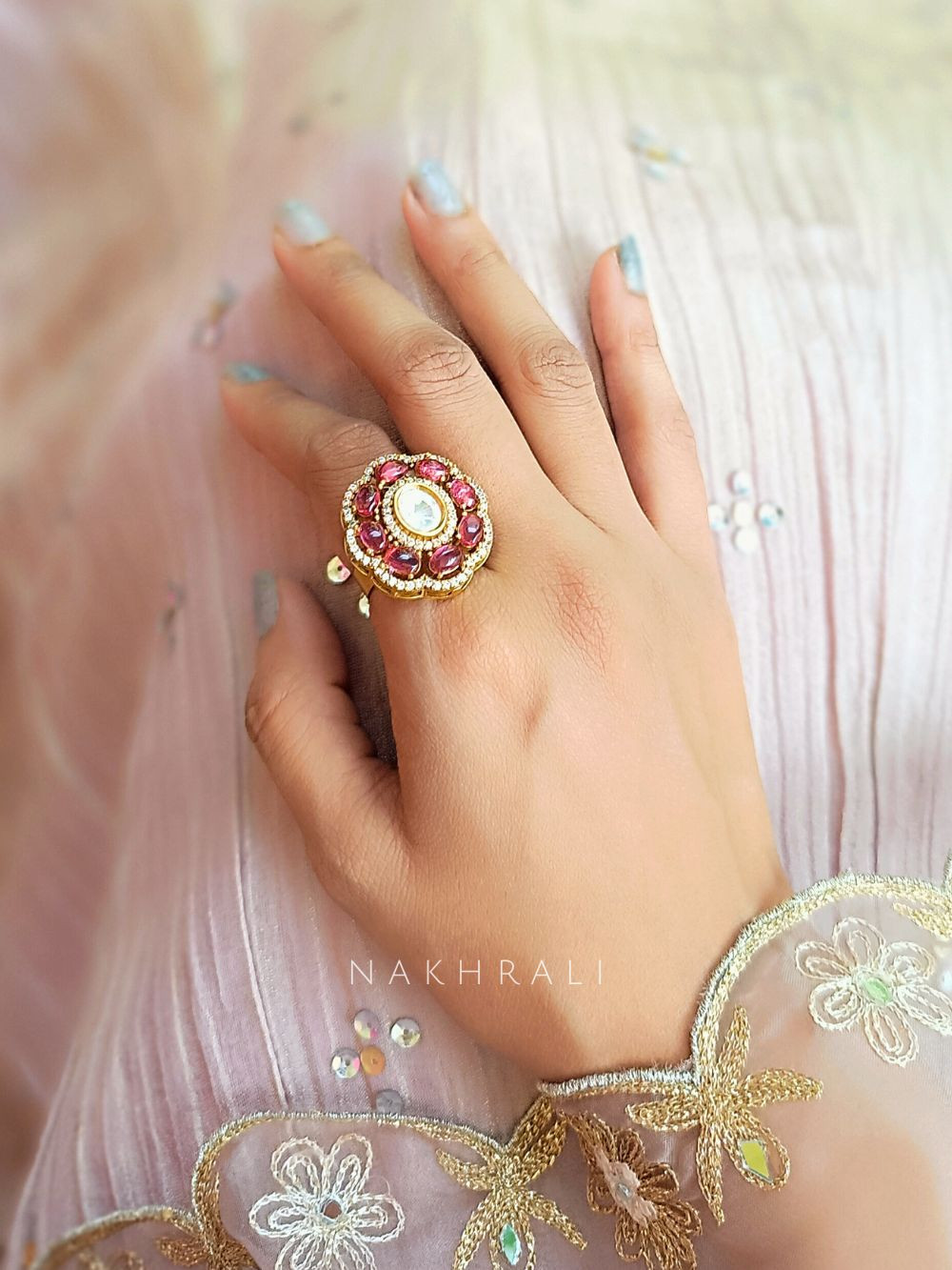 The Radiant Ruby Floral Adjustable Ring is a stunning piece crafted to add a regal charm to your ensemble. Designed in a bold floral motif, it features a captivating central kundan framed with ruby red stones, accentuated by sparkling diamond-like embellishments. The intricate detailing and gold-toned setting make it a versatile accessory, ideal for weddings, festive occasions, or evening celebrations. Its adjustable band ensures a comfortable fit, making it suitable for all. Elevate your traditional outfits with this timeless jewel that brings both grace and glamour to your look.