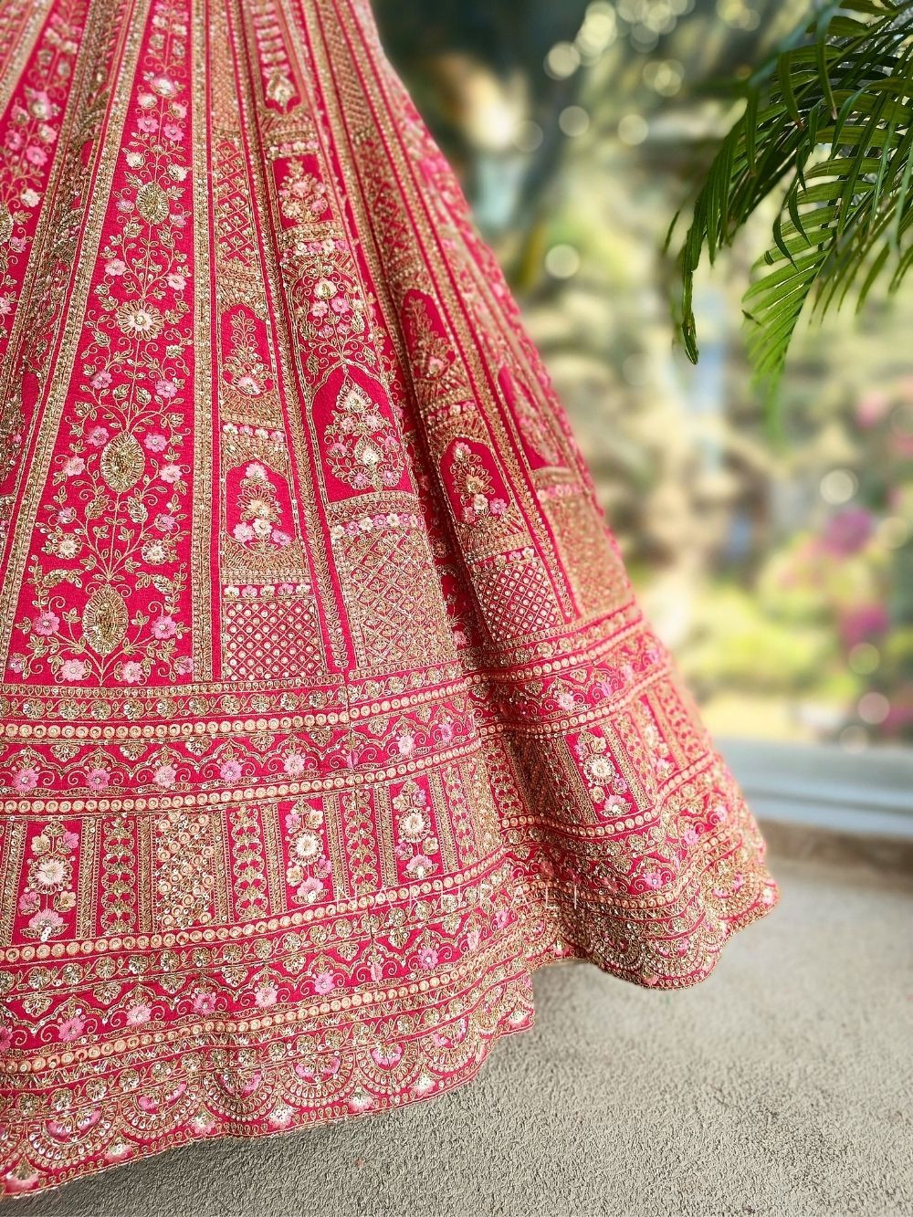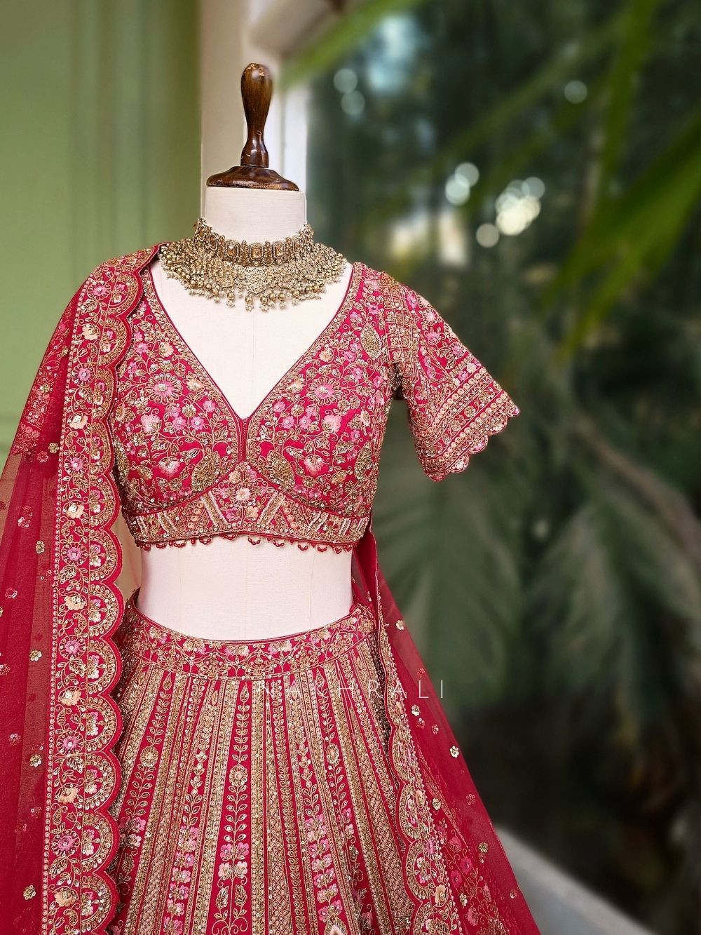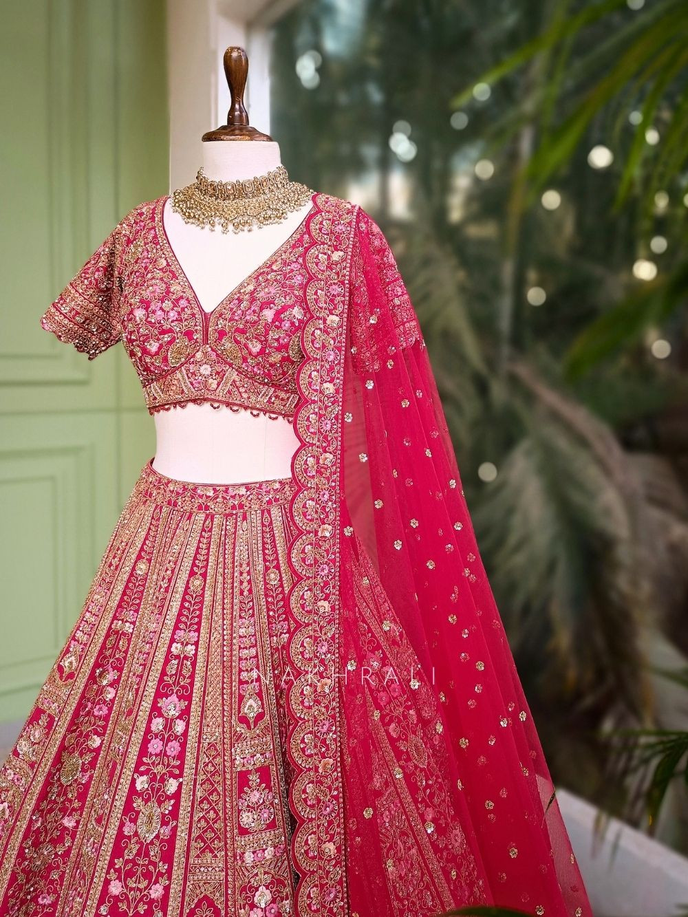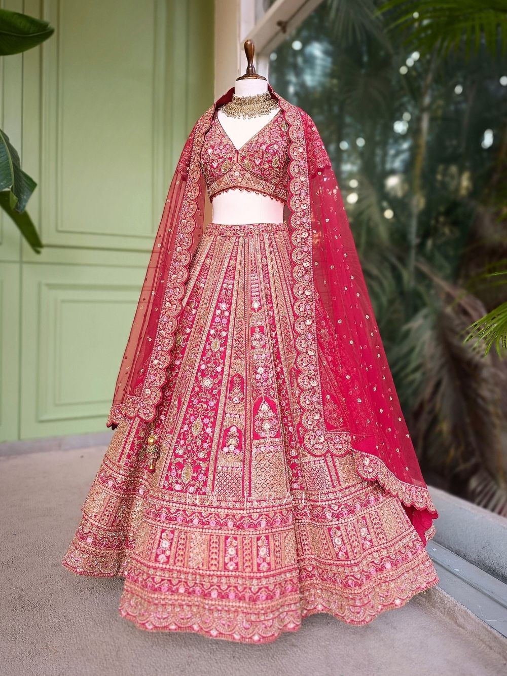 This red bridal lehenga is crafted with dense all-over embroidery featuring traditional floral and geometric motifs highlighted through zari and sequin work. The skirt showcases finely detailed vertical panels that flow into a heavily embroidered border, creating a rich and regal silhouette. The blouse is designed with a deep V neckline and elaborate embroidery across the body and sleeves, offering a classic bridal finish. Completing the set is a sheer dupatta detailed with delicate motifs and a scalloped embroidered edge, perfectly balancing richness and grace. Designed for main wedding ceremonies, this lehenga makes a powerful bridal statement.