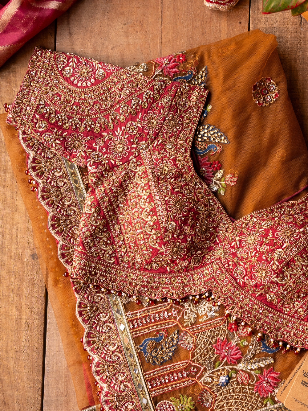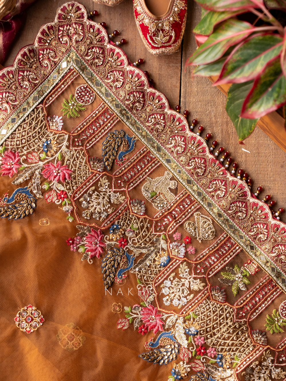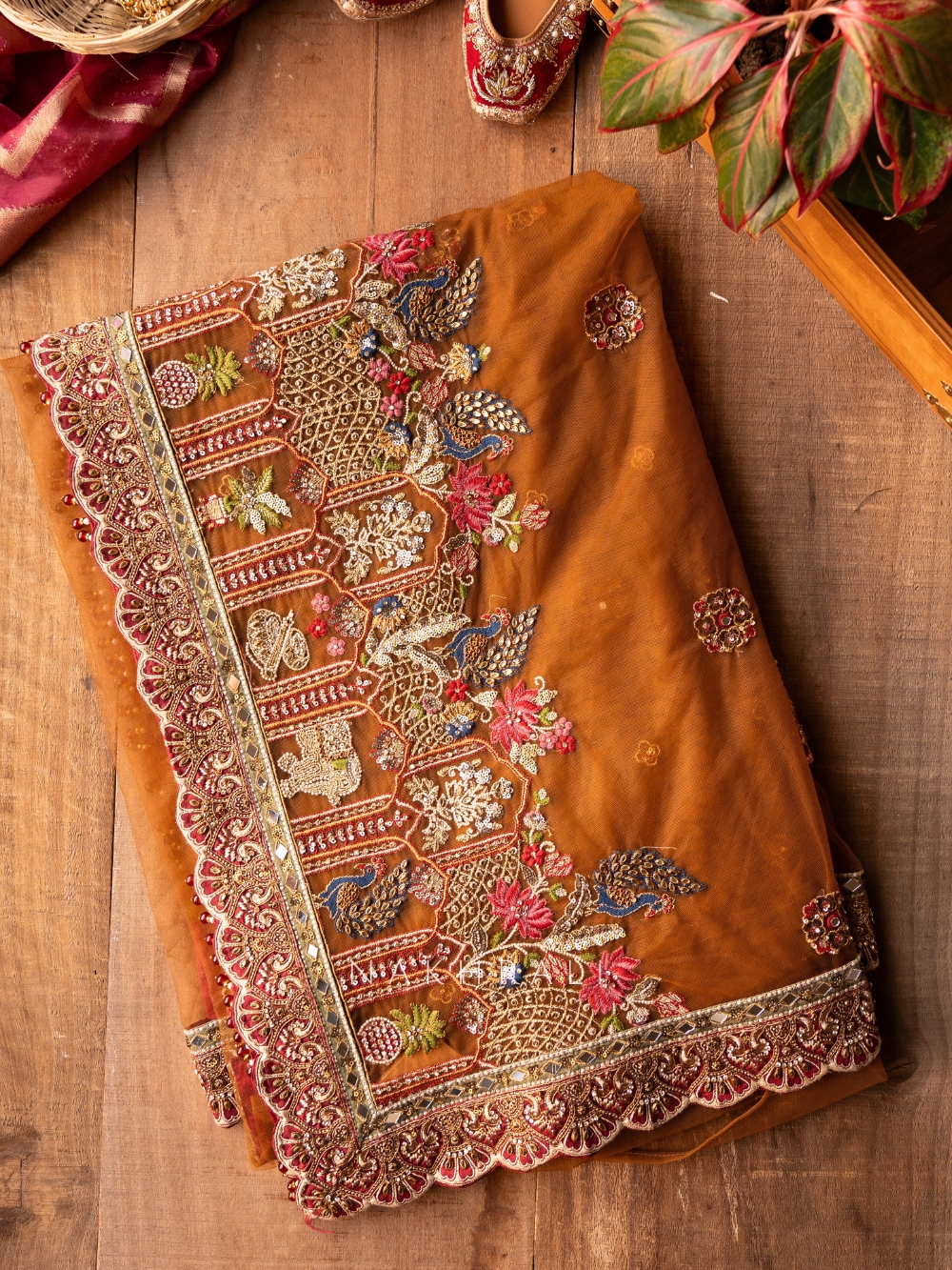 The Rangmahal Rustic Orange Net Saree is a masterpiece that celebrates Indian craftsmanship and grandeur. The saree features a stunning play of zari, sequin, and stone work, intricately woven into rich motifs including elephants, tablas, peacocks, and floral patterns—each telling a story of heritage and festivity. The embroidered border enhances its regal charm with fine detailing and scalloped edges. It is paired with a deeply embellished blouse in a contrasting red shade, adorned with intricate zari, sequin, and thread embroidery that complements the saree beautifully. Perfect for weddings, festive occasions, or royal celebrations, this saree embodies elegance, artistry, and timeless allure.
