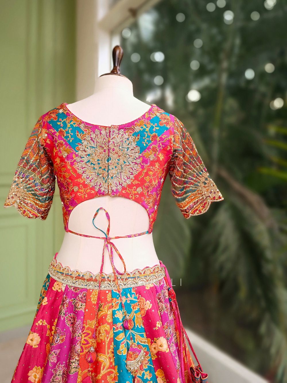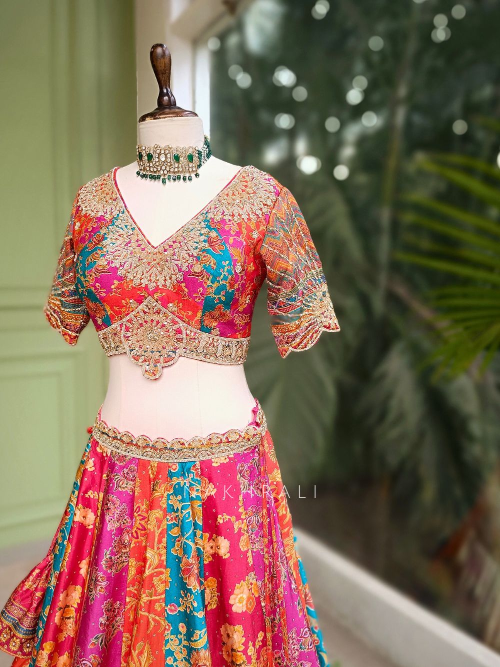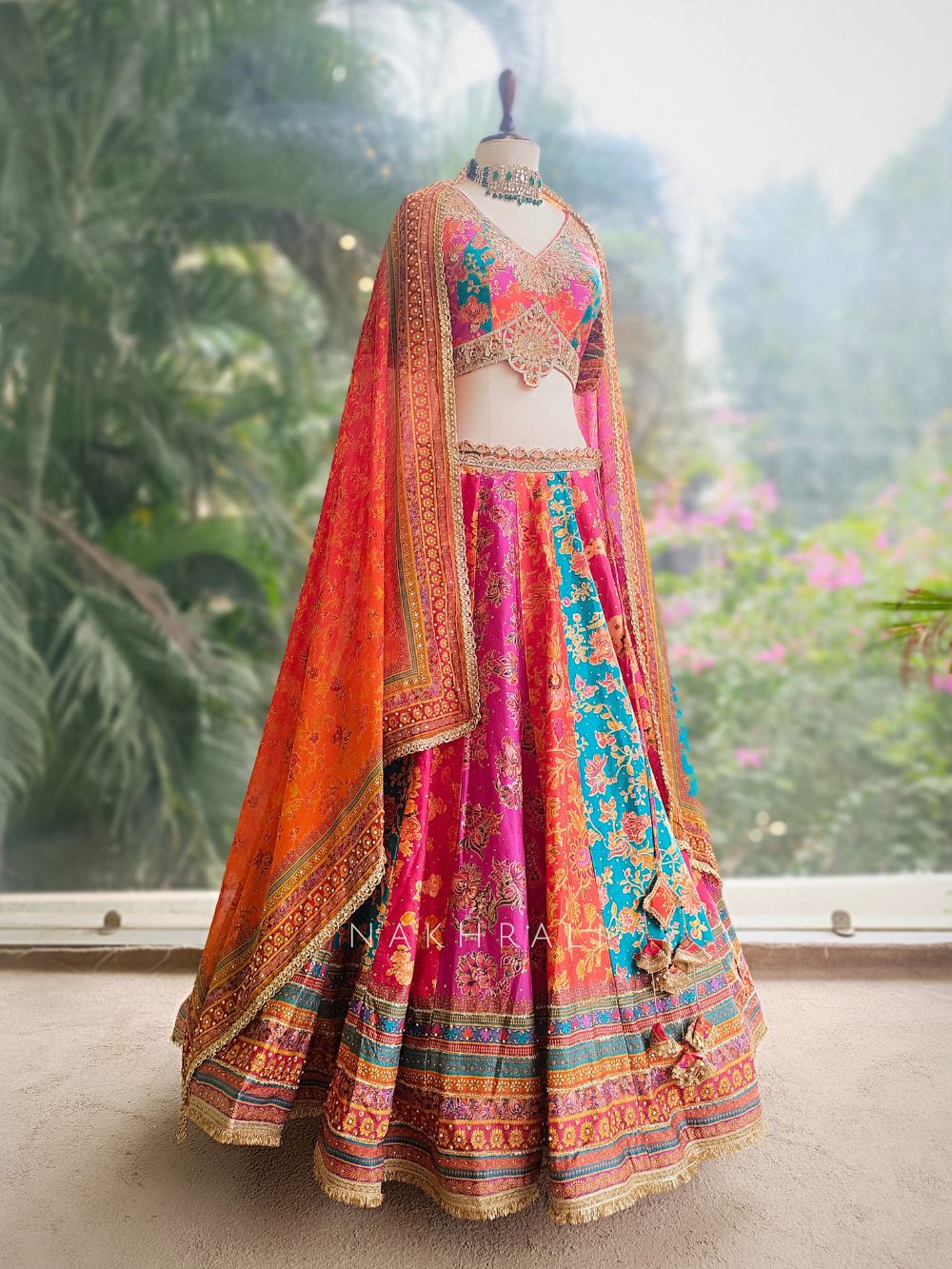 Pair with emerald or kundan jewellery to highlight the bold color contrasts.