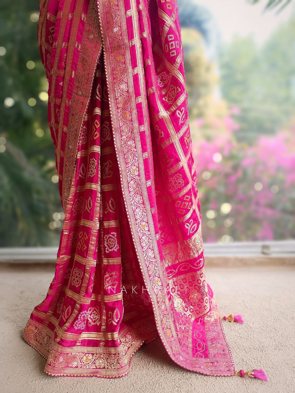 This bandhani saree showcases classic tie-dye artistry enhanced with intricate traditional motifs spread evenly across the drape. The standout feature is its heavy, ornate border that adds depth and grandeur to the overall look, finished with delicate gota work along the edges for a subtle festive shimmer. The saree flows beautifully and holds structure well, making it ideal for occasions that call for traditional elegance. It comes with a matching unstitched blouse piece attached to the saree, allowing it to be stitched in the preferred style.