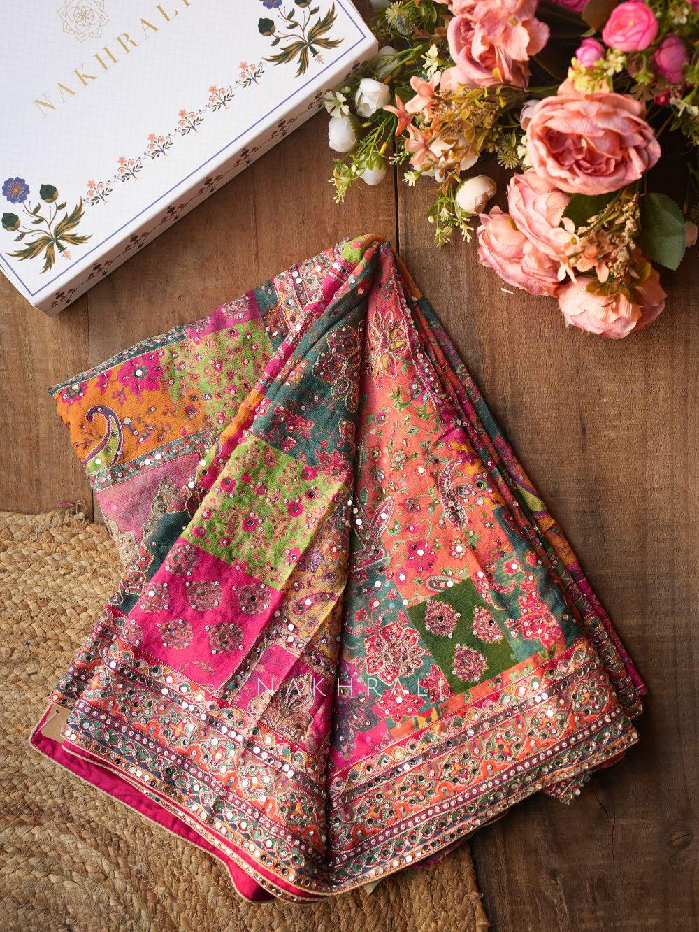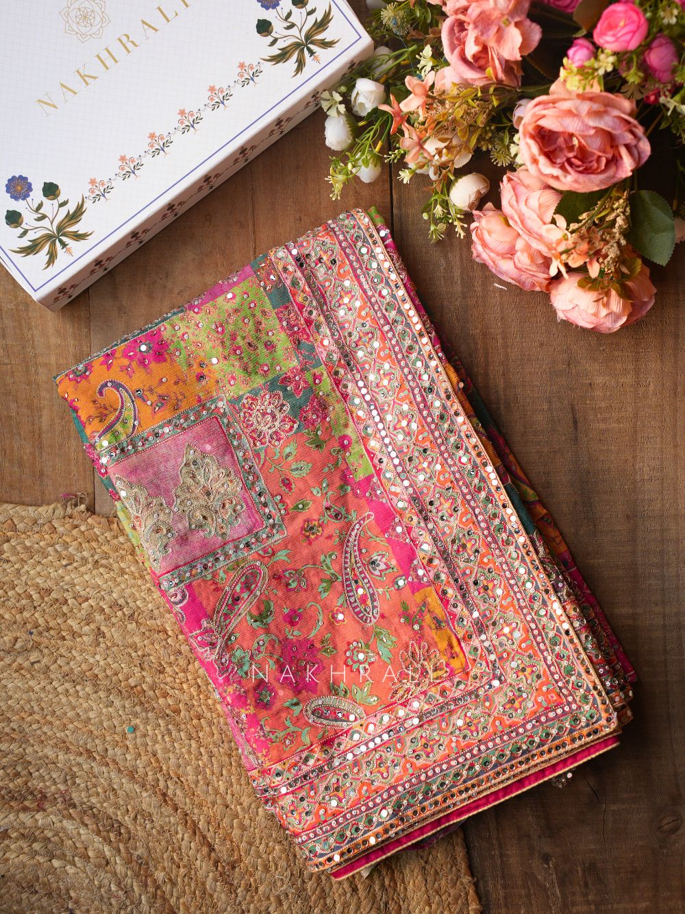 This vibrant saree showcases a rich blend of colors arranged in artistic patch-inspired patterns that bring depth and visual richness to the drape. The design is enhanced with intricate mirror and thread embroidery placed across motifs and borders, creating a dazzling handcrafted appeal. The ornate border adds definition to the drape while delicate embellishments scattered across the saree elevate its festive charm. It is paired with a coordinated readymade blouse featuring matching embroidery and structured detailing that complements the bold aesthetic. Perfect for weddings, festive gatherings and cultural celebrations.