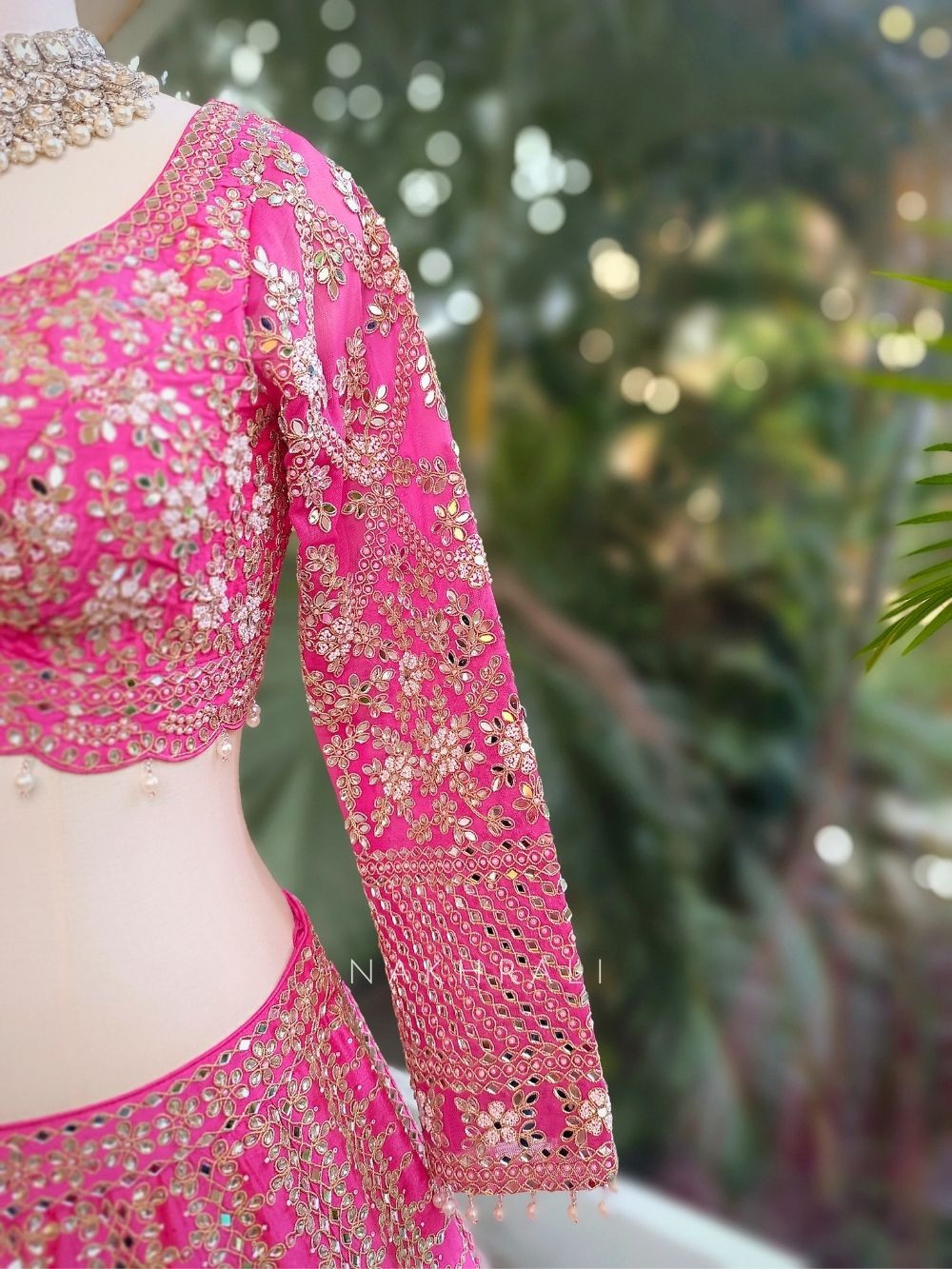 Dry clean only to maintain intricate work. Store in a muslin cloth to prevent snagging. Avoid folding heavily embellished areas. Keep away from direct sunlight and perfumes. Handle with care to preserve mirror and bead detailing.