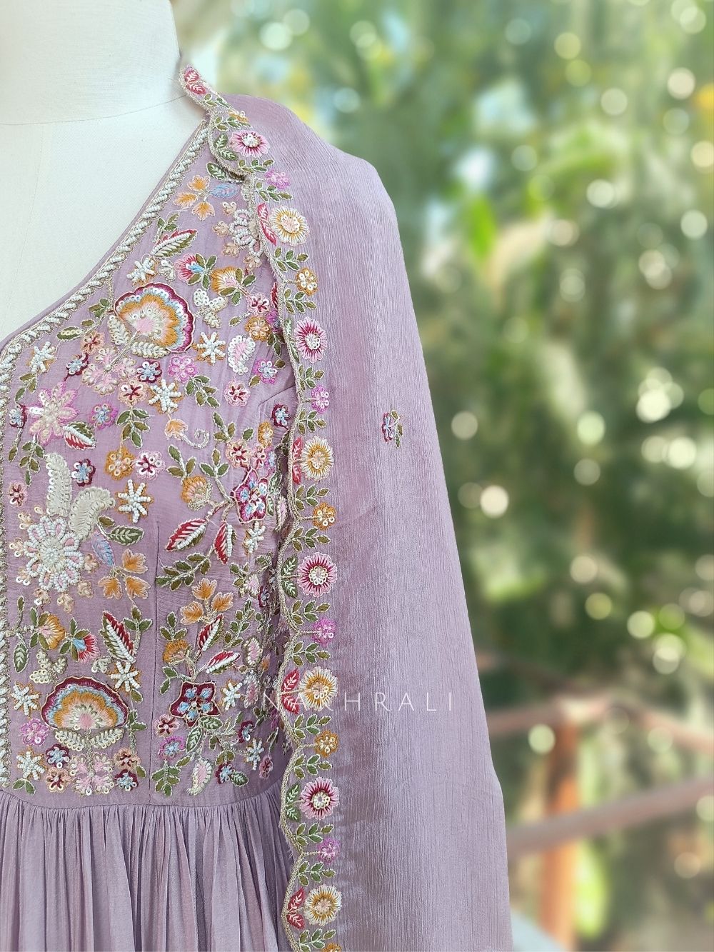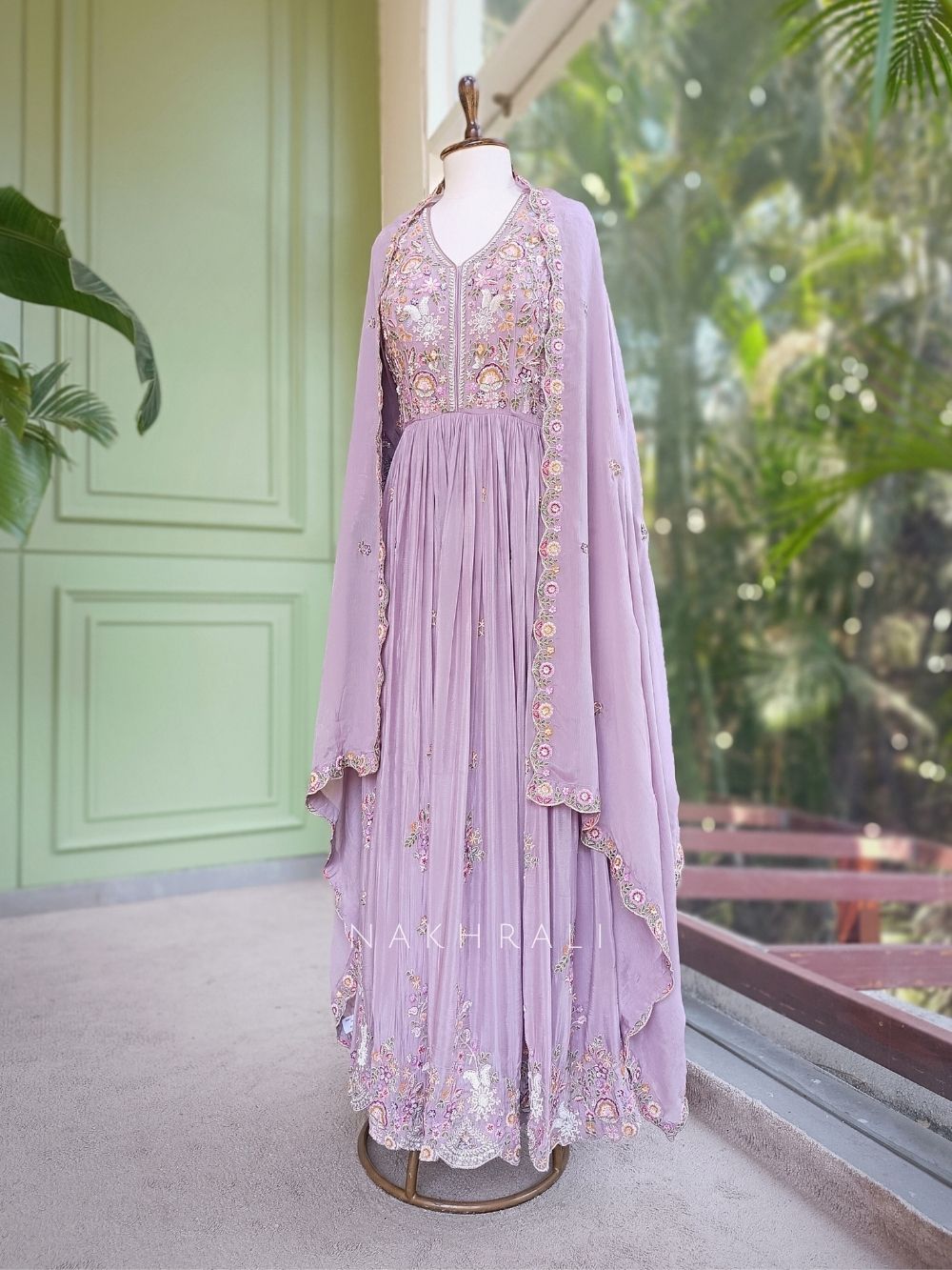 This stunning purple Anarkali set is designed to bring elegance and charm to special occasions. The long Anarkali silhouette features beautifully detailed multicolor embroidery across the bodice, creating a vibrant yet refined statement. The intricate floral embroidery combined with delicate bead embellishments adds depth, texture, and subtle shimmer to the outfit. The flowing Anarkali design enhances movement and creates a graceful silhouette that feels both regal and effortless. It is paired with a complementing dupatta featuring embroidered borders and delicate motifs that elevate the entire ensemble with a soft festive touch. Ideal for festive gatherings, bridal trousseau collections, and bridesmaid celebrations, this outfit perfectly blends traditional artistry with a sophisticated modern appeal.