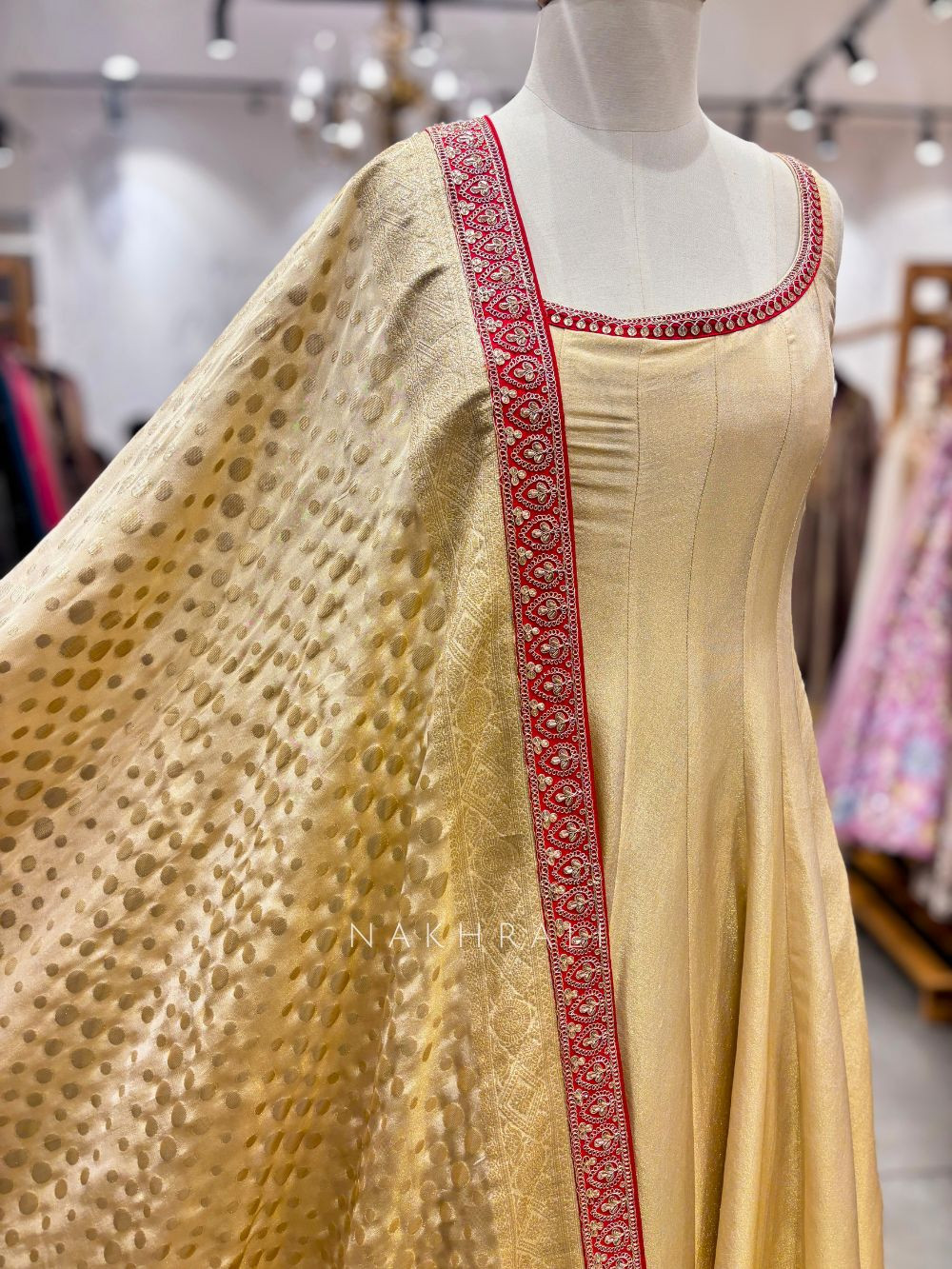 This elegant Anarkali and gharara set blends classic craftsmanship with a refined festive charm. The Anarkali features a structured flare and a clean neckline enhanced with delicate sequin detailing. The dupatta carries an all-over zari weave and a beautifully finished border that elevates the look. Paired with a matching gharara featuring coordinated borders, this outfit is ideal for weddings, receptions, sangeet, and traditional celebrations where you want a regal yet effortless appearance.