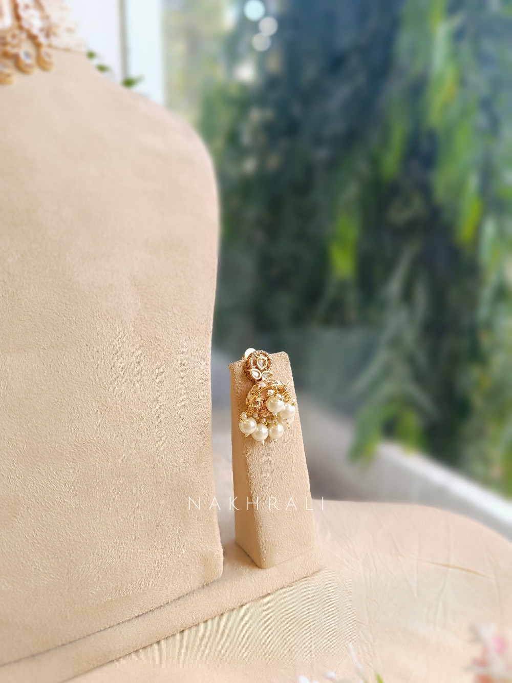 This white pearl choker set showcases an elegant handcrafted centrepiece surrounded by kundan stones, paired with multiple strands of delicate micro-pearls. The design sits gracefully on the neckline, offering a balanced mix of sophistication and traditional charm. Finished with matching pearl jhumka earrings, it creates a complete bridal and festive-ready look. Perfect for weddings, sangeet events and classic traditional outfits.