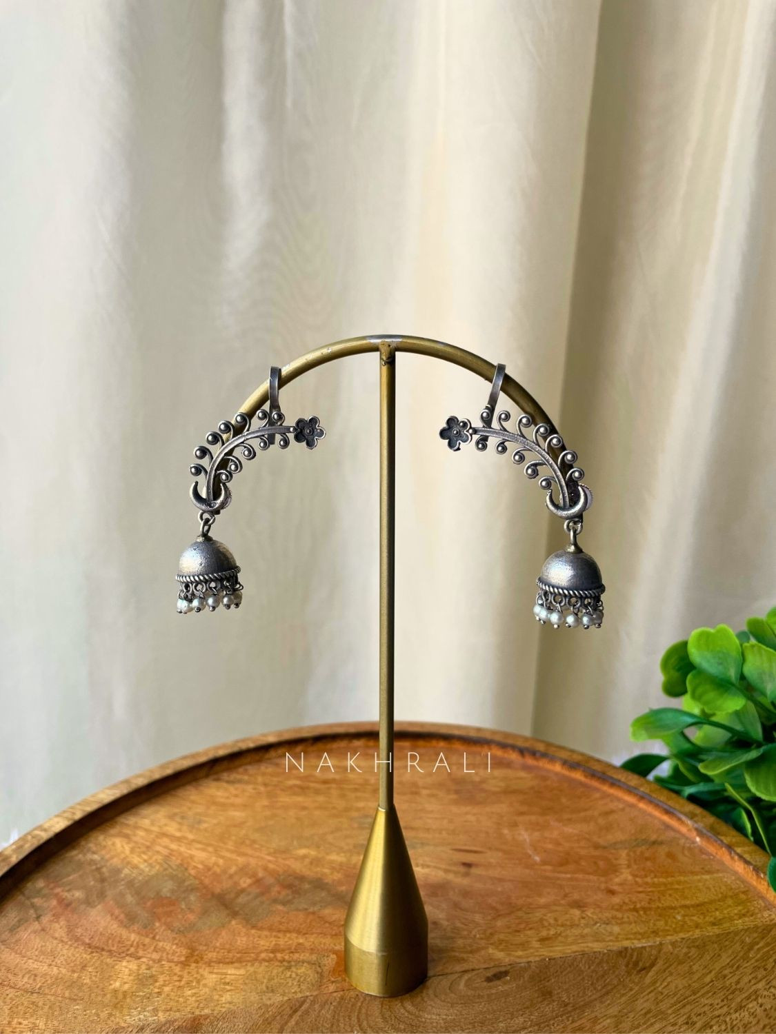 These earcuff jhumkas are designed with an elegant curved silhouette that hugs the ear, highlighted by intricate scroll detailing and a delicate floral accent. The sculpted dome jhumka is finished with subtle pearl drops, adding movement without overpowering the design. Perfect for those who love traditional jewellery with a distinctive, contemporary edge, this piece makes an impact while staying refined and wearable.