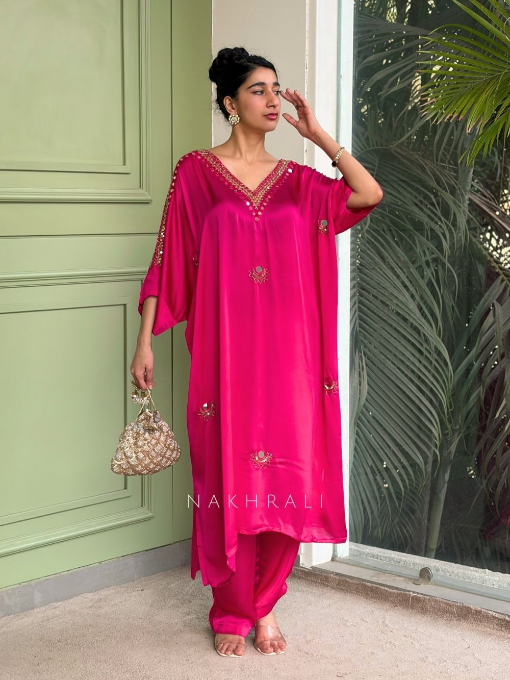 This magenta pant kurta set blends bold colour with refined detailing. The kurta showcases beautifully placed mirror and sequin work along the neckline, creating a striking focal point without overpowering the look. Coordinated embellishments on the sleeves add balance and finesse. Paired with a comfortable matching pant, the silhouette remains fluid and flattering, making it ideal for festive gatherings, family functions, and celebratory evenings where you want to look polished yet relaxed.