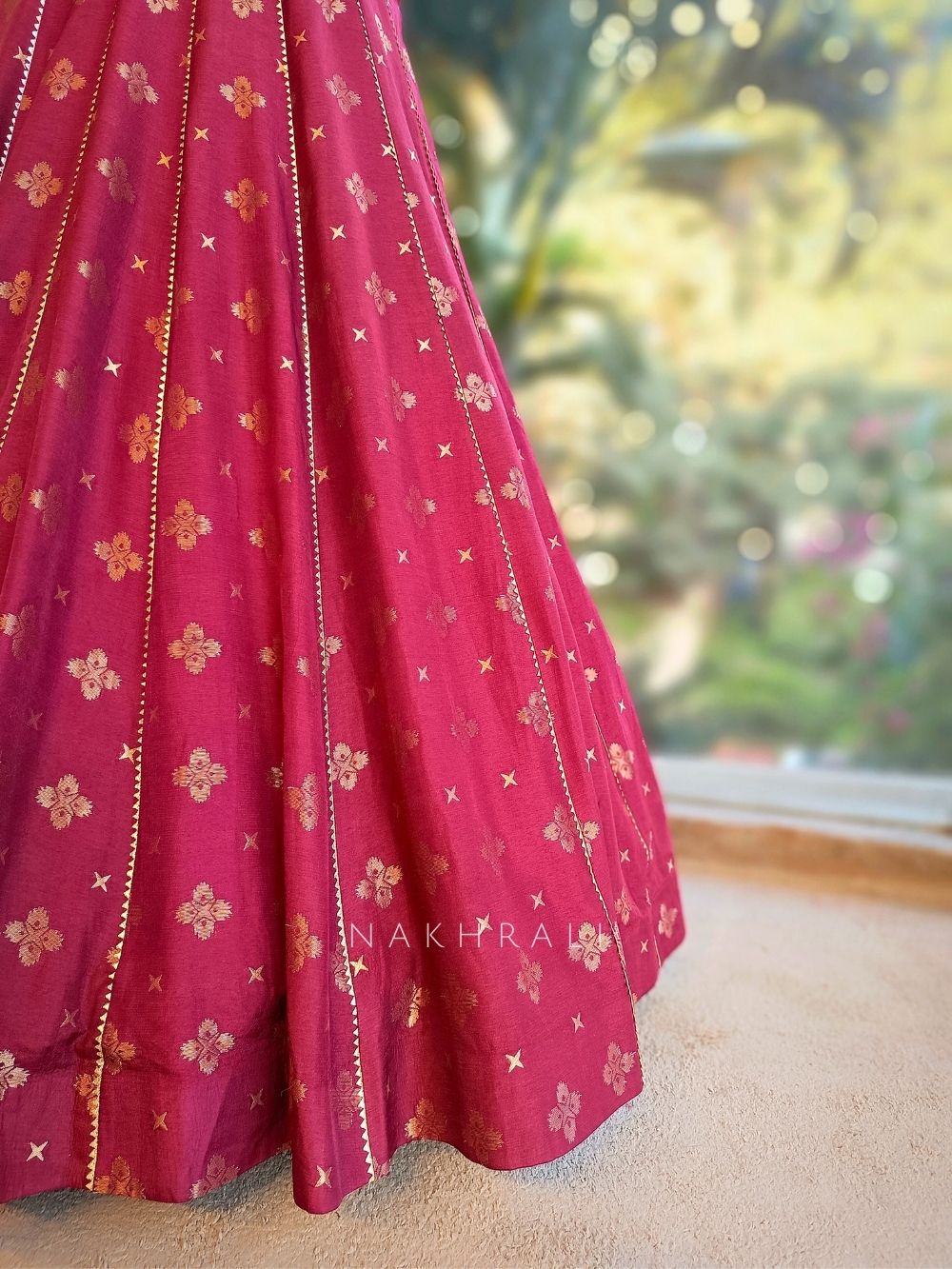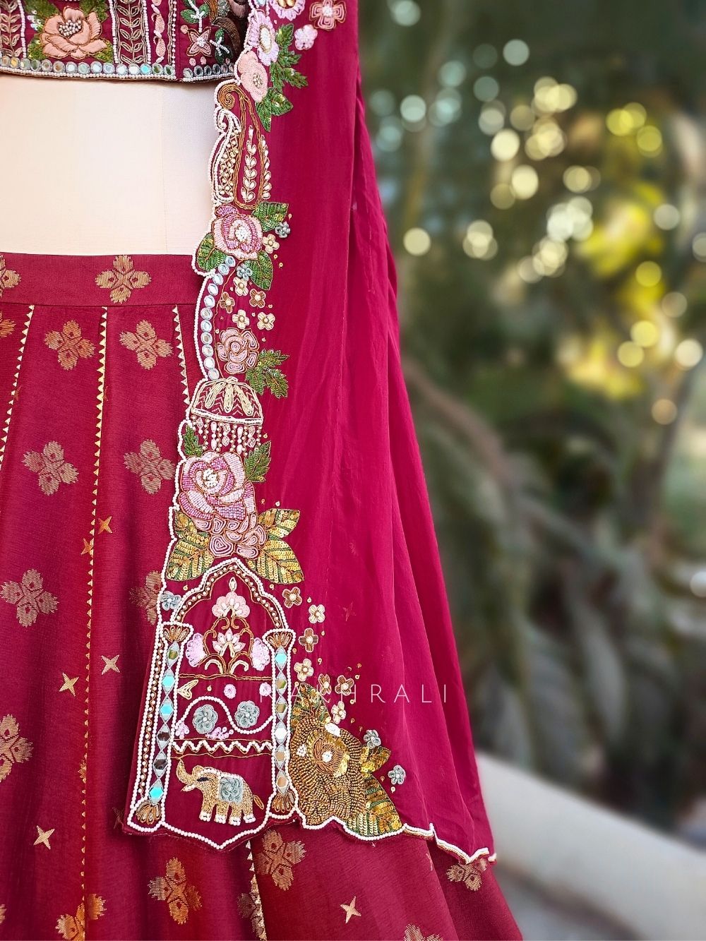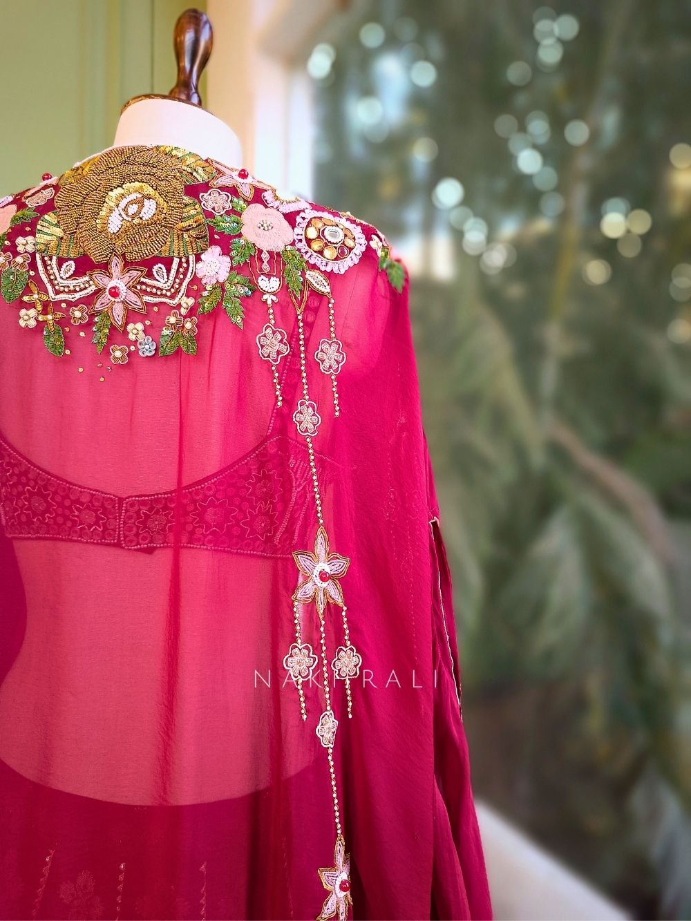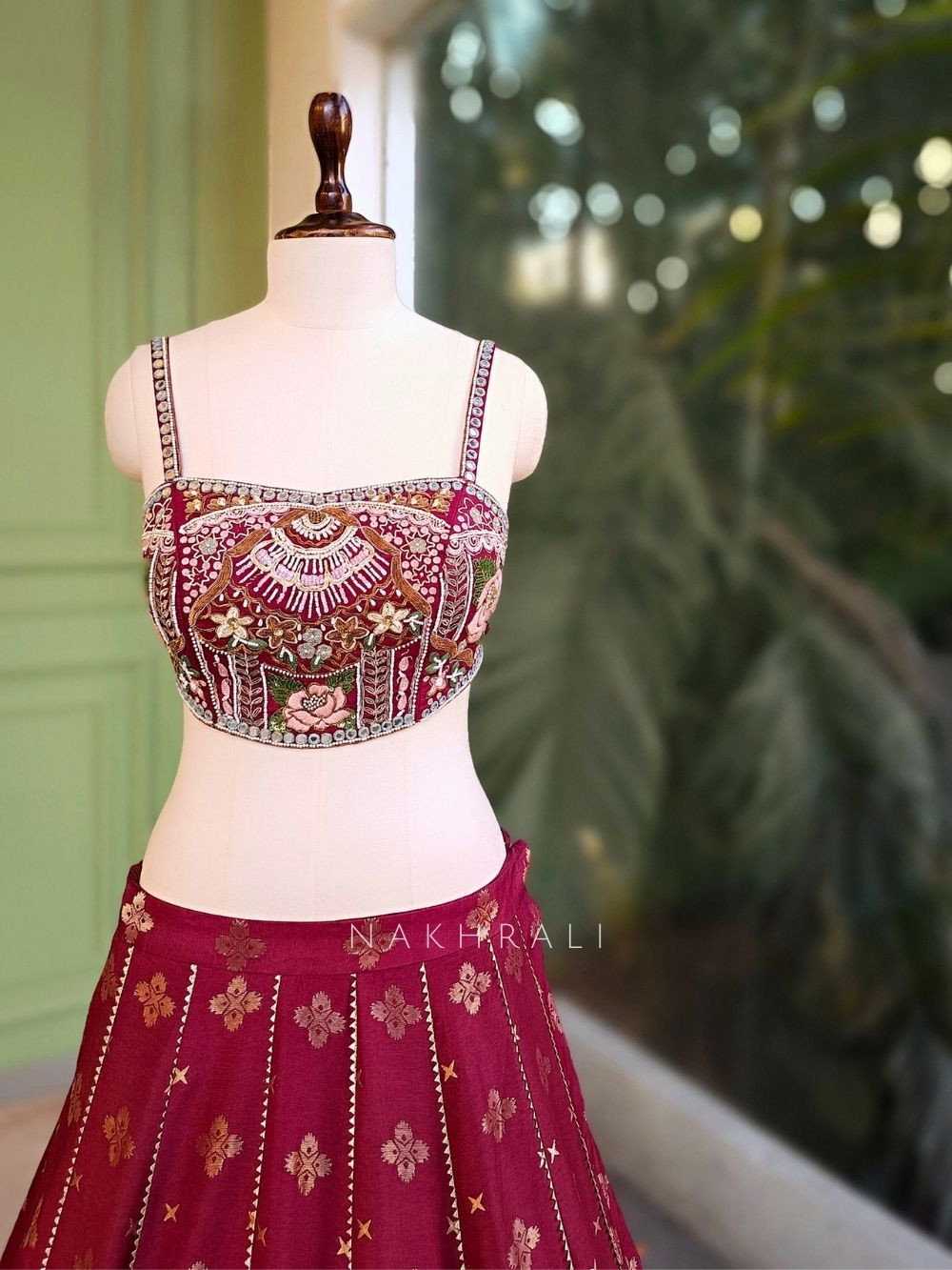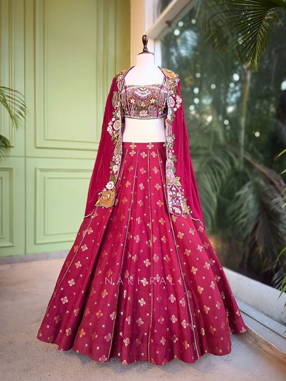 This maroon indowestern lehenga set blends traditional craftsmanship with a contemporary silhouette. The blouse is richly embroidered with intricate motifs that add depth and character, while the flowing lehenga skirt features subtle woven detailing that enhances movement. Completing the look is a statement cape shrug adorned with elaborate embroidery and hanging accents, creating a layered, fashion-forward appeal. The coordinated elements make this set ideal for cocktail functions, festive evenings, and modern wedding celebrations where elegance meets individuality.