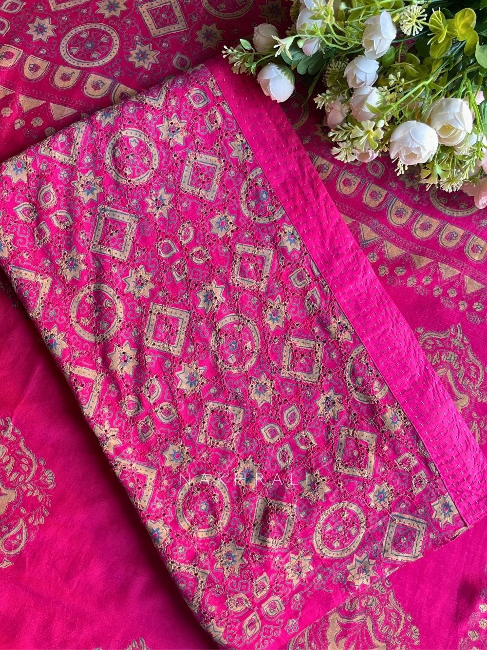 Rivana Magenta Printed Dress Material with Handcrafted Motif Work