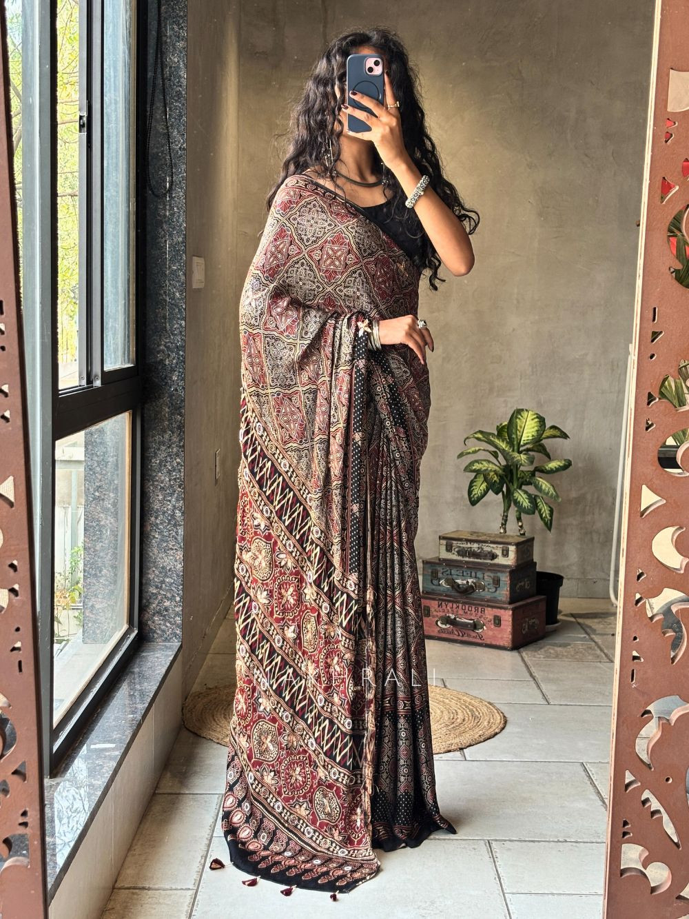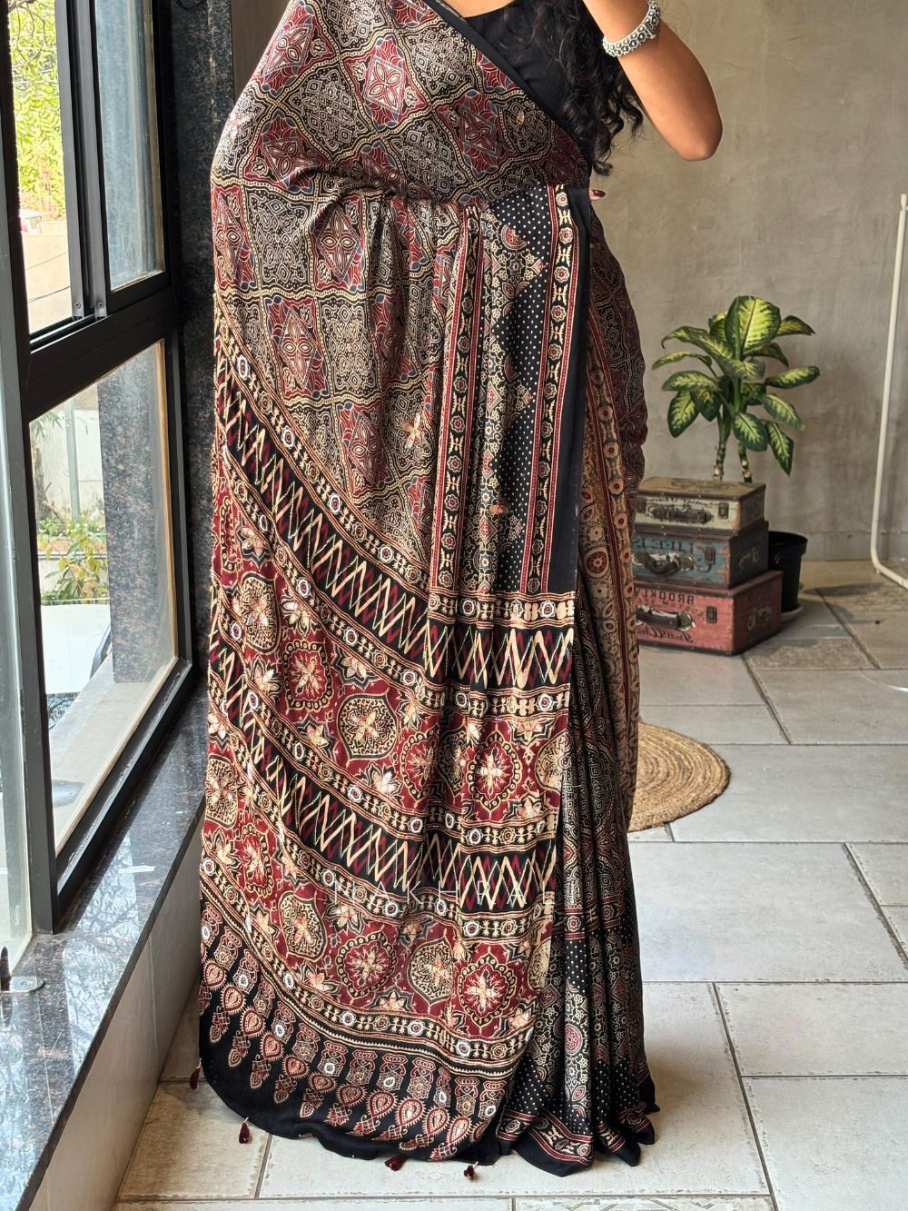 This modal silk saree is crafted in a soft, fluid drape that falls beautifully on the body, making it comfortable yet striking. The saree showcases detailed traditional-inspired prints across the body, balanced with a richly highlighted pallu finished with zari and sequin work for a subtle festive touch. The lightweight texture allows easy styling while maintaining a refined look suitable for both daytime and evening wear. It comes with a matching running blouse piece attached to the saree, allowing it to be stitched in the preferred style. (The blouse worn by the model is for styling purposes only.)