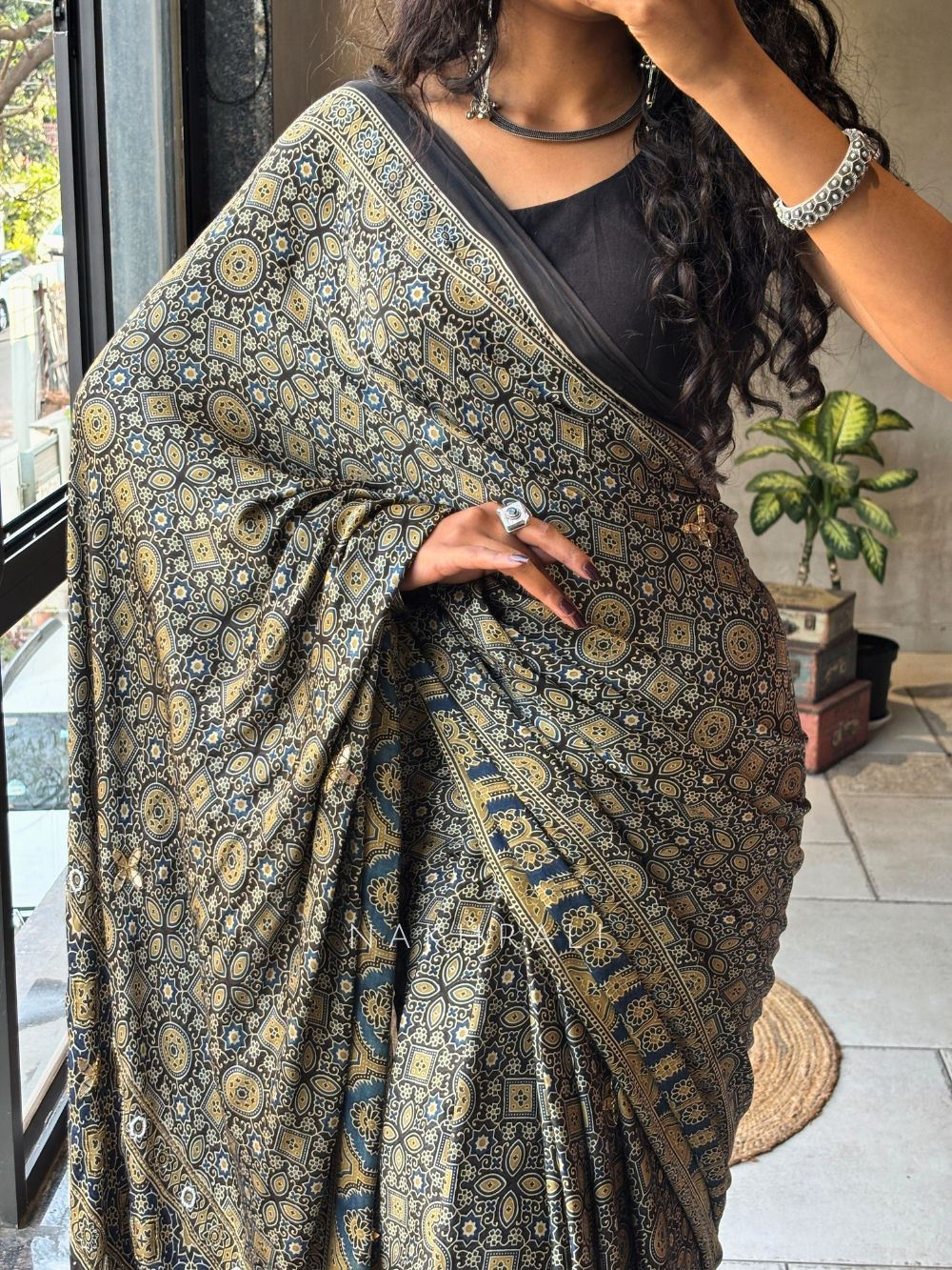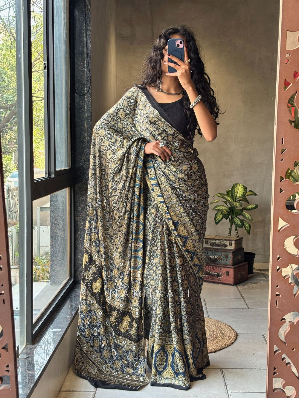This modal silk saree is crafted in a soft, fluid drape that falls beautifully on the body, making it comfortable yet striking. The saree showcases detailed traditional-inspired prints across the body, balanced with a richly highlighted pallu finished with zari and sequin work for a subtle festive touch. The lightweight texture allows easy styling while maintaining a refined look suitable for both daytime and evening wear. It comes with a matching running blouse piece attached to the saree, allowing it to be stitched in the preferred style. (The blouse worn by the model is for styling purposes only.)