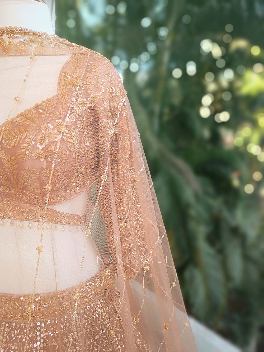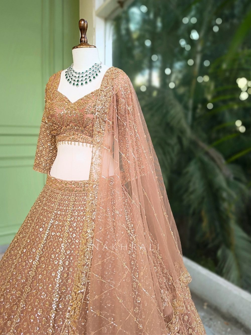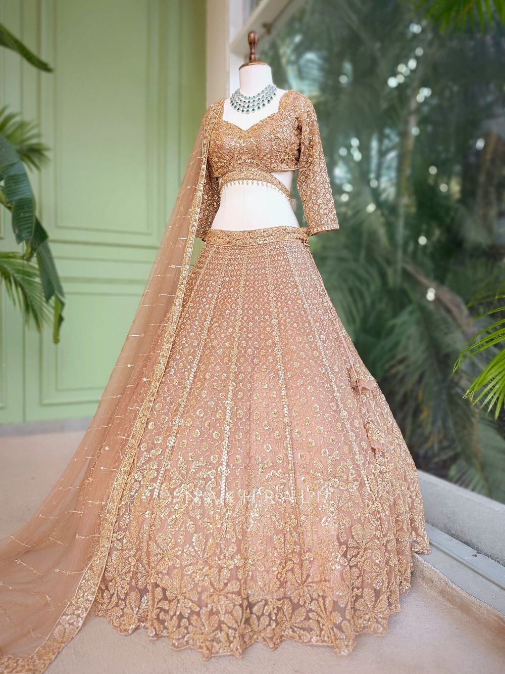 This lehenga set features intricate gold floral embroidery spread evenly across the flared skirt, creating a rich and balanced visual appeal. The lehenga is paired with a beautifully embroidered blouse designed with a sweetheart neckline and elbow-length sleeves, finished with delicate detailing along the hem. Completing the set is a sheer purple dupatta highlighted with subtle embroidery and fine border accents. The overall look is refined yet striking, making it ideal for weddings, receptions, and grand festive celebrations where elegance takes center stage.
