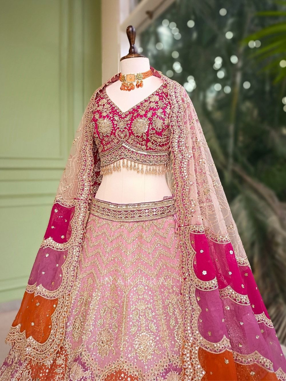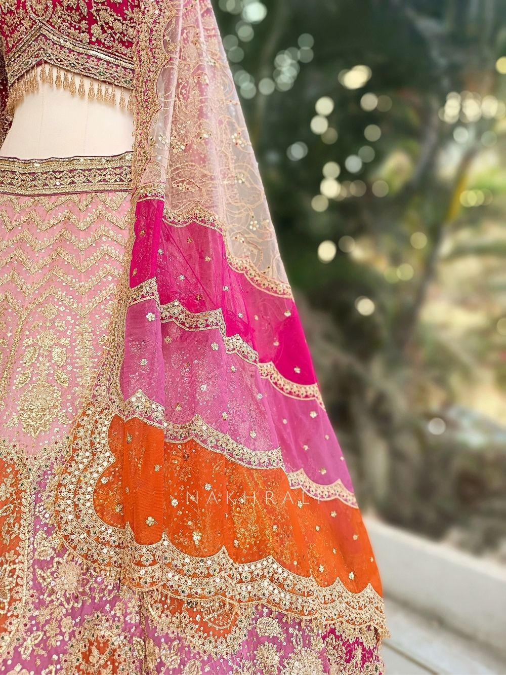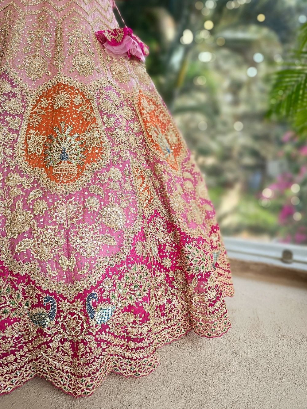This pink lehenga set stands out with its elaborate surface detailing and traditional craftsmanship. The skirt showcases dense all-over embroidery with ornate floral and peacock-inspired motifs highlighted through zari, sequins and bead accents. The blouse features heavy embroidery with a structured neckline, tassel detailing at the hem and a tie-up back for a secure fit. Complemented by a sheer dupatta with scalloped embroidered borders and delicate embellishments, this ensemble delivers a regal presence perfect for celebrations that demand elegance and impact.