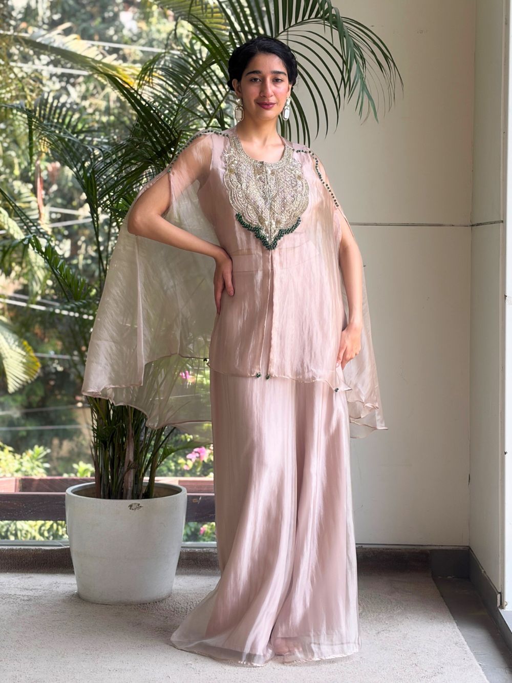 Rivasha Light Pink Kaftan Set with Sequin and Bead Embellished Yoke