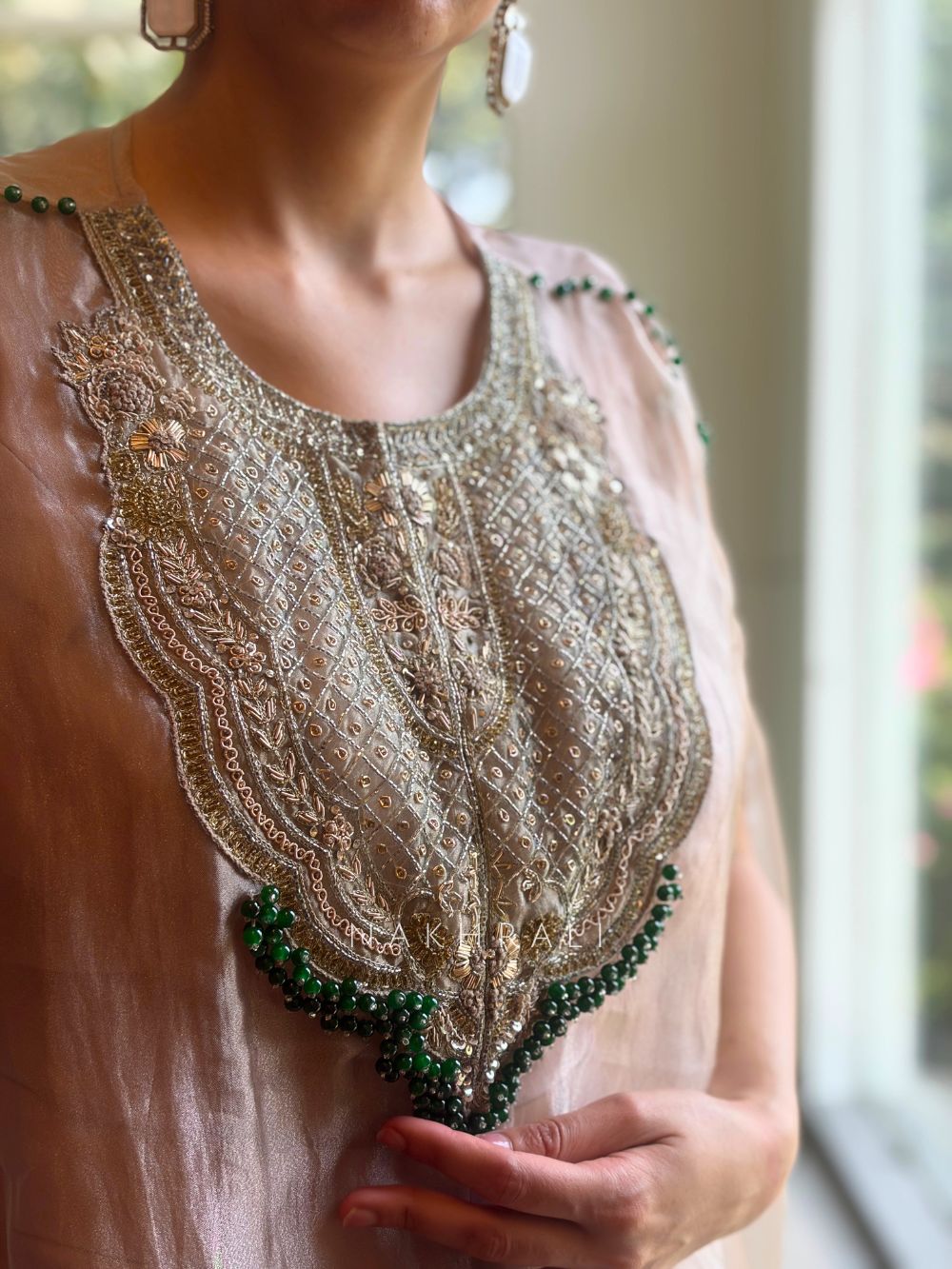 This kaftan set is designed in a soft, flowy silhouette known for its relaxed and elegant drape, offering both comfort and statement appeal. Kaftans are typically loose, wide-sleeved garments that create effortless movement and a flattering fit for all body types. The highlight of this outfit is its intricately embellished neckline yoke, detailed with fine sequin and bead work that adds subtle shimmer and depth. The fluid structure paired with matching bottoms makes it ideal for festive gatherings, intimate celebrations and refined day events.