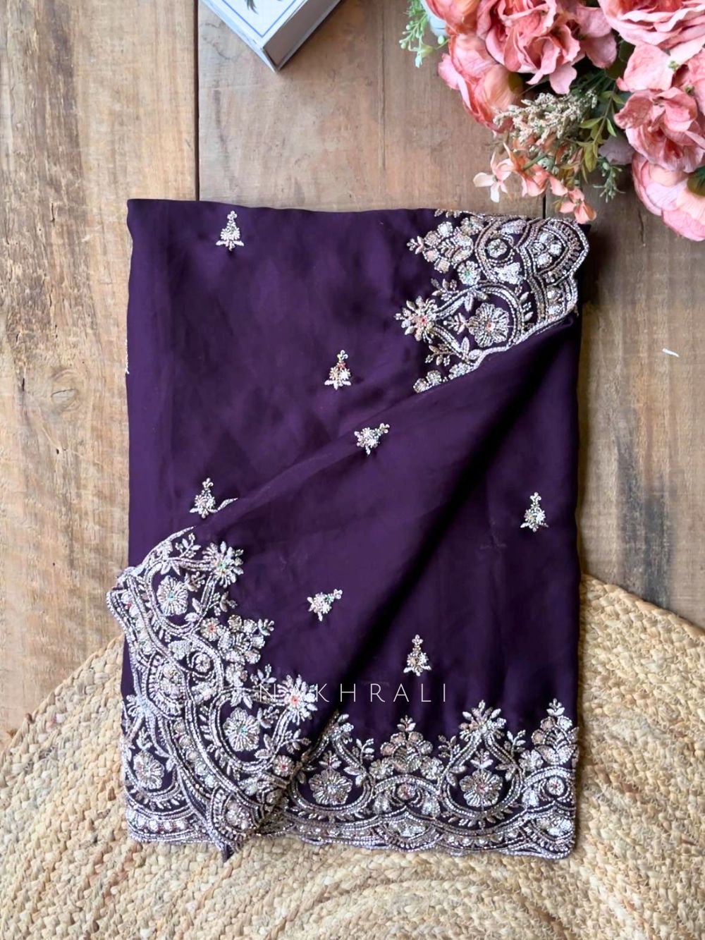 This saree showcases fine craftsmanship with detailed cut dana and sequin embroidery forming an ornate border and delicate motifs across the drape. The design brings a balanced blend of richness and elegance, making it ideal for festive occasions, wedding functions, and evening celebrations. It comes with a matching running blouse piece, also enhanced with coordinated embroidery to complete the look seamlessly.