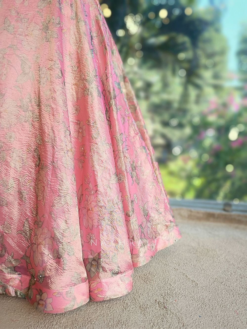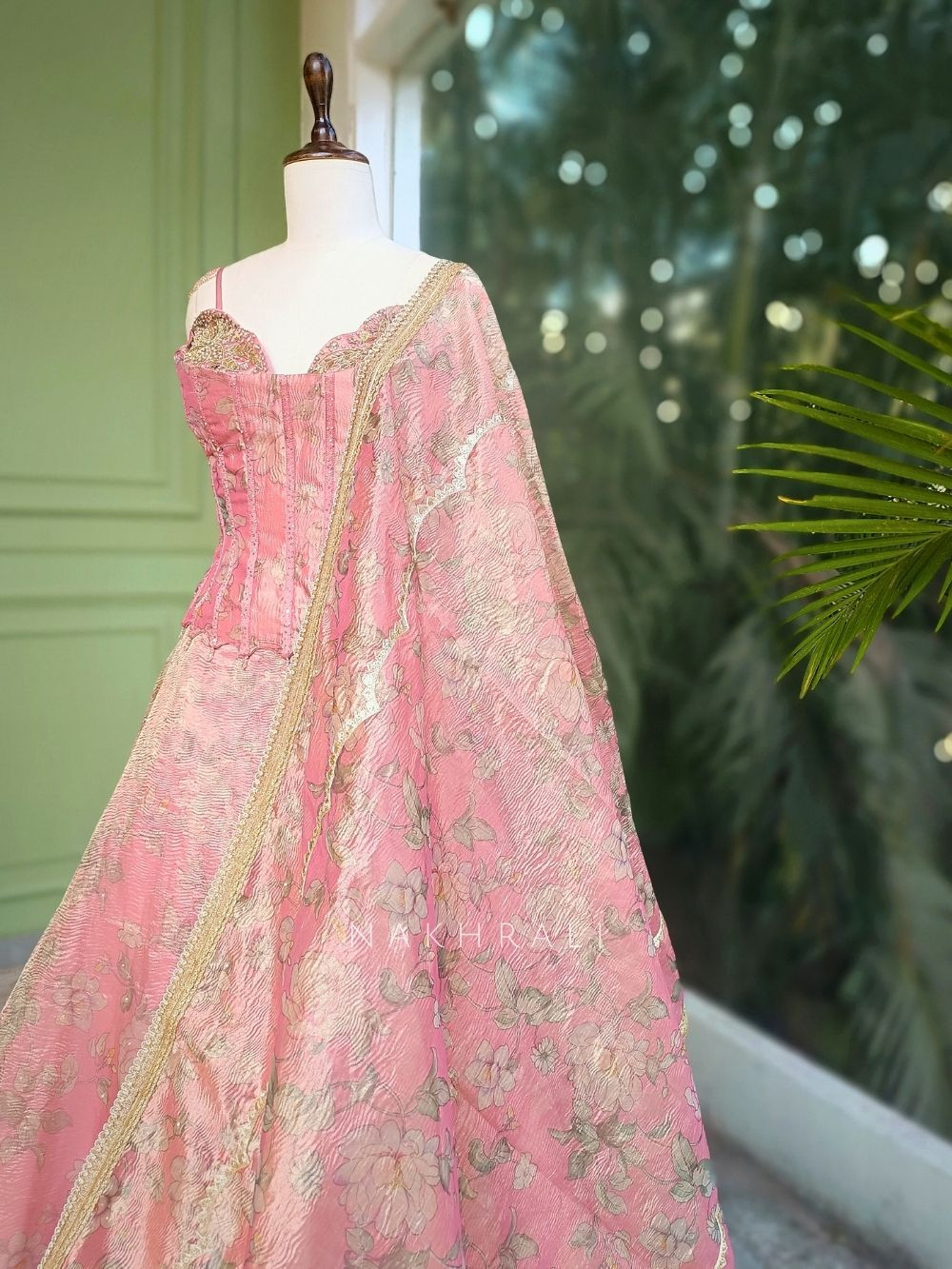 This pink floral lehenga set blends elegance with modern charm, featuring a beautifully crafted corset blouse adorned with delicate embellishments and structured panel detailing. The lehenga showcases an all-over floral pattern with subtle shimmer, creating a soft and romantic silhouette. Paired with a coordinated dupatta edged with ornate borders, this ensemble is perfect for weddings, receptions, and festive celebrations where grace meets contemporary style.