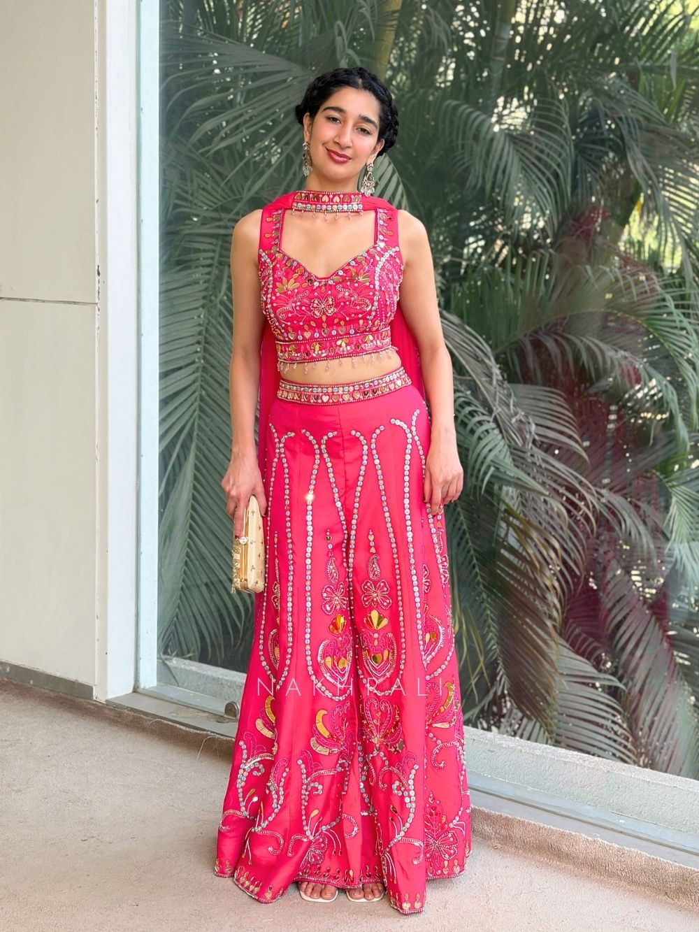 Rangriti is a celebration-ready magenta crop top and palazzo set designed to stand out. The crop top features detailed sequin and bead embroidery arranged in elegant motifs, giving it a rich handcrafted appeal. The matching palazzo is balanced with coordinated embellishment, adding flow and grace to the silhouette. Completing the ensemble is a choker-style dupatta that enhances the neckline and adds a contemporary festive touch. This set is ideal for sangeet nights, wedding festivities, festive gatherings, and special celebrations where bold colour and craftsmanship matter.