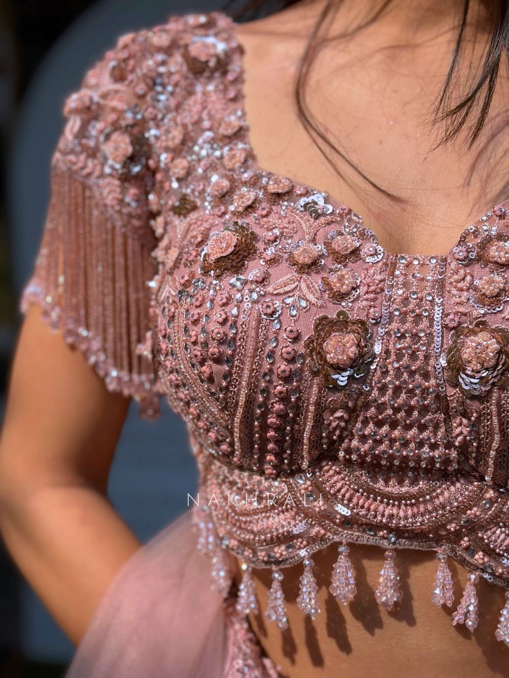 This blush-pink bridal lehenga is crafted in premium net and adorned with heavy 3D floral embroidery, sequins, pearls, crystal tassels, and textured beadwork. The blouse features sculpted floral motifs with fringe detailing, while the voluminous skirt carries a fully embellished pattern with ornate scallop borders. Paired with a soft net dupatta highlighted with matching handwork, it creates a radiant, statement bridal silhouette ideal for sangeet, engagement, or reception.