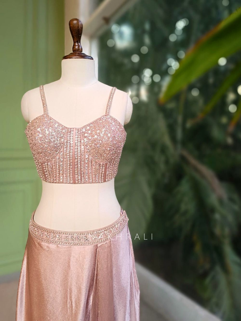 This pink corset top and skirt set is crafted to deliver a clean, contemporary silhouette with a soft festive glow. The corset top features detailed sequin work that adds texture and shine while offering a structured, flattering fit. The skirt flows gracefully with a subtle drape, creating movement and elegance. Completing the look is a matching cape shrug adorned with sequin work, adding drama without overpowering the outfit. Together, the ensemble strikes a balance between modern styling and occasion-ready sophistication, making it ideal for elevated celebrations.