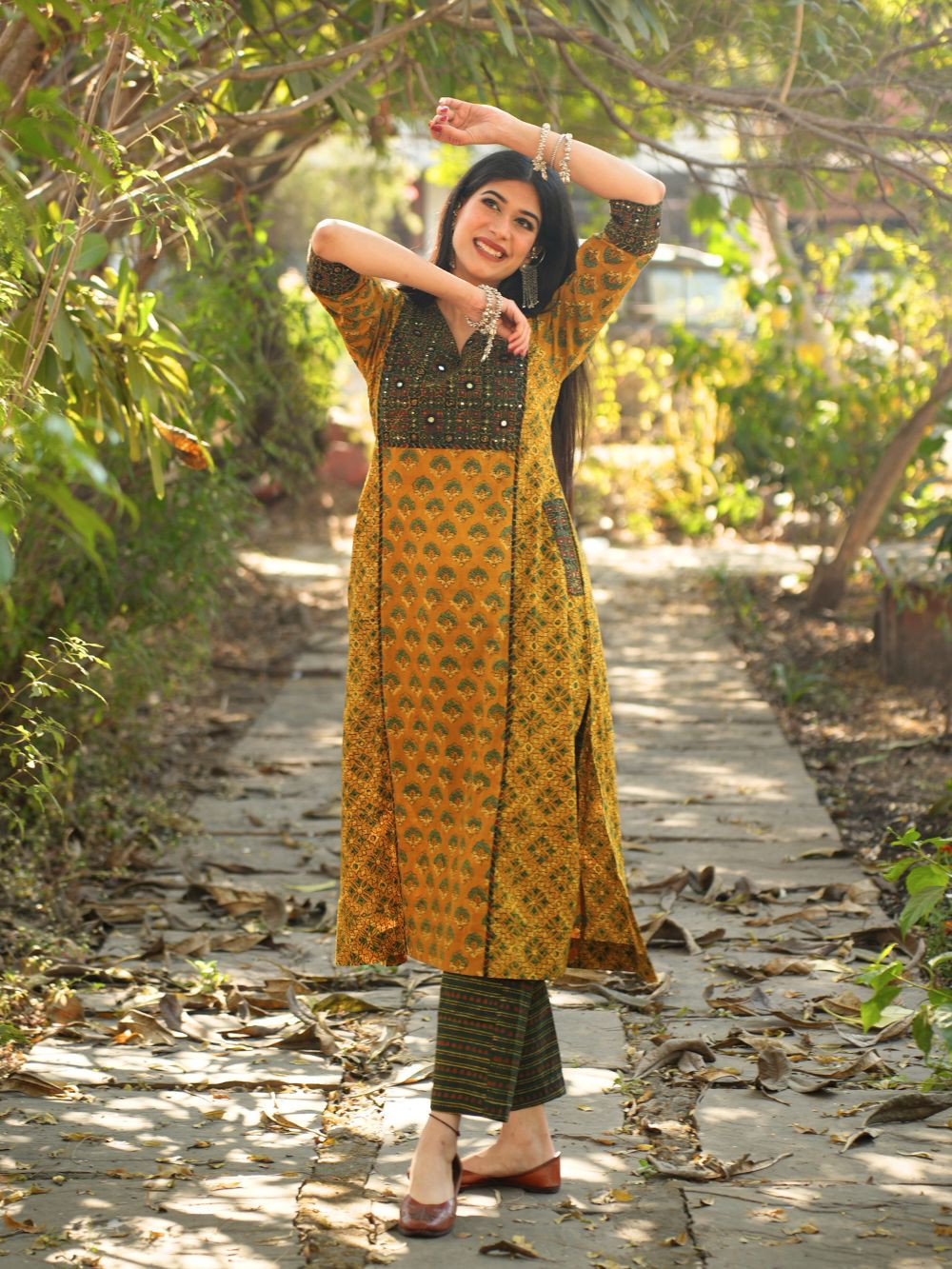 Rozana is a versatile mustard cotton kurta designed for effortless daily dressing. Crafted in breathable cotton, it features detailed patch work on the neckline and sleeves that adds character while keeping the look subtle and wearable. The flared silhouette offers comfort and movement, while side pockets add everyday practicality. Easy to pair with pants, palazzos, or leggings, this kurta is made for regular wear without compromising on detail.